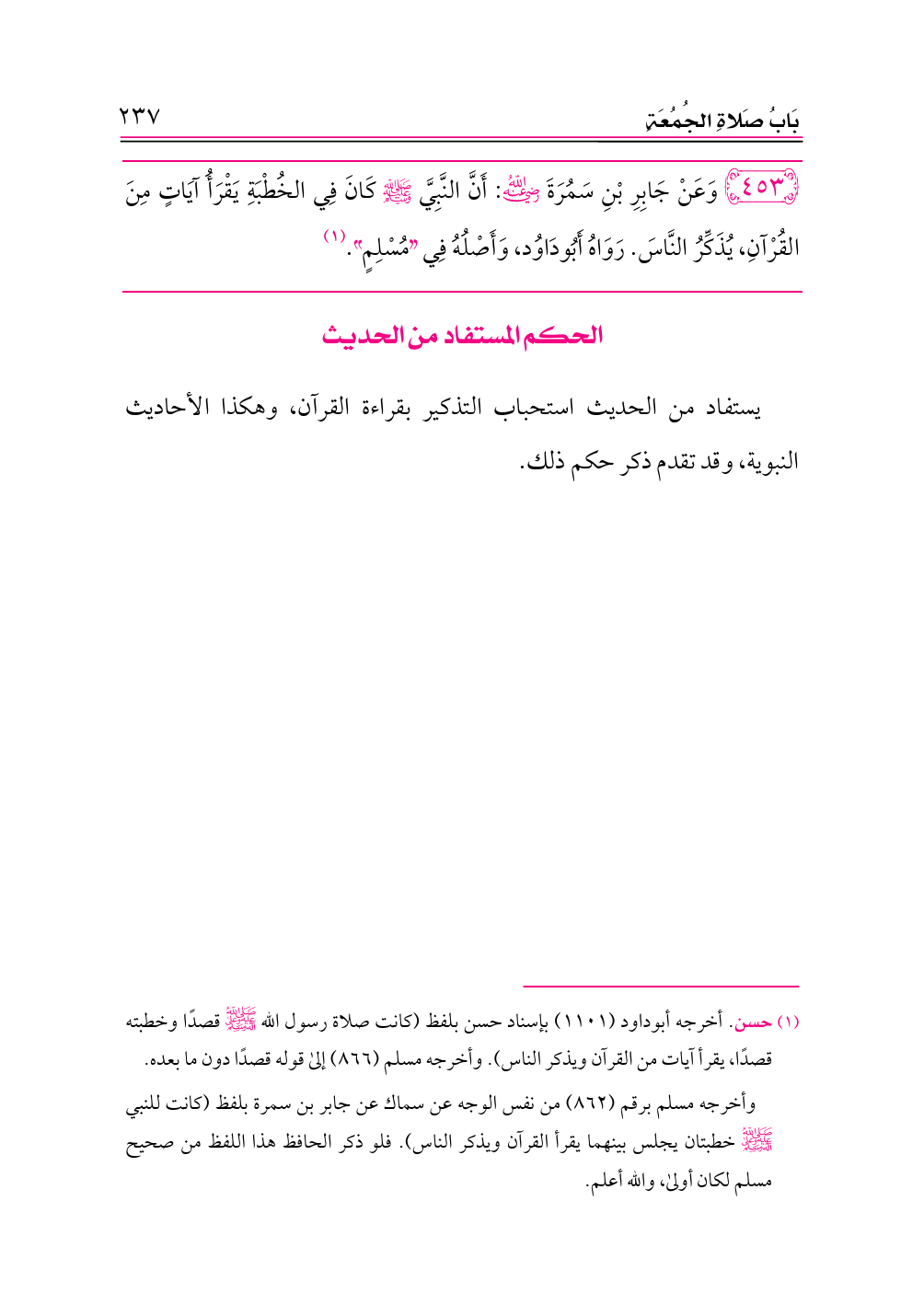 ٤٥٤ - وَعَنْ طَارِقِ بْنِ شِهَابٍ -رضي الله عنه- أَنَّ رَسُولَ اللهِ - صلى الله عليه وسلم - قَالَ: «الجُمُعَةُ حَقٌّ وَاجِبٌ عَلَى كُلِّ مُسْلِمٍ فِي جَمَاعَةٍ إلَّا أَرْبَعَةً: مَمْلُوكٌ، وَامْرَأَةٌ، وَصَبِيٌّ، وَمَرِيضٌ». رَوَاهُ أَبُودَاوُد، وَقَالَ: لَمْ يَسْمَعْ طَارِقٌ مِنَ النَّبِيِّ - صلى الله عليه وسلم -. (¬١)