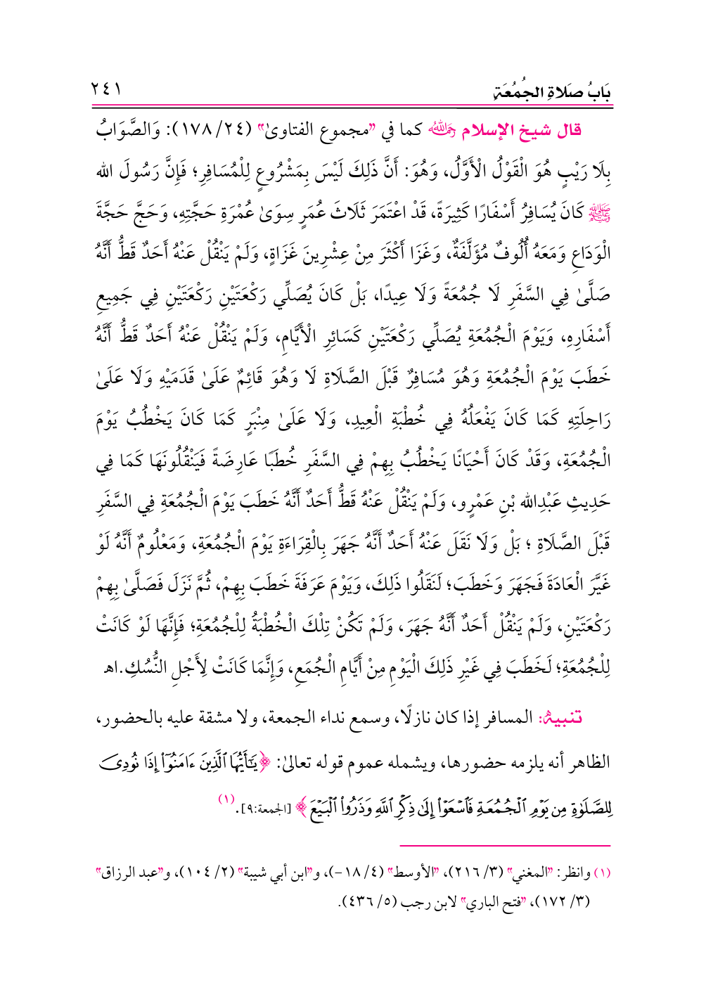 تنبيه: وجوب حضور الجمعة بعد سماع النداء مخصوصٌ بما إذا احتاج إلى السفر في ذلك الوقت، وبمن يستطيع صلاة الجمعة في مكان آخر، فلكليهما أن يسافرا ولو بعد النداء، والله أعلم. وقد نبَّه على ذلك الإمام ابن عثيمين -رحمه الله- في «الشرح الممتع». (¬١)