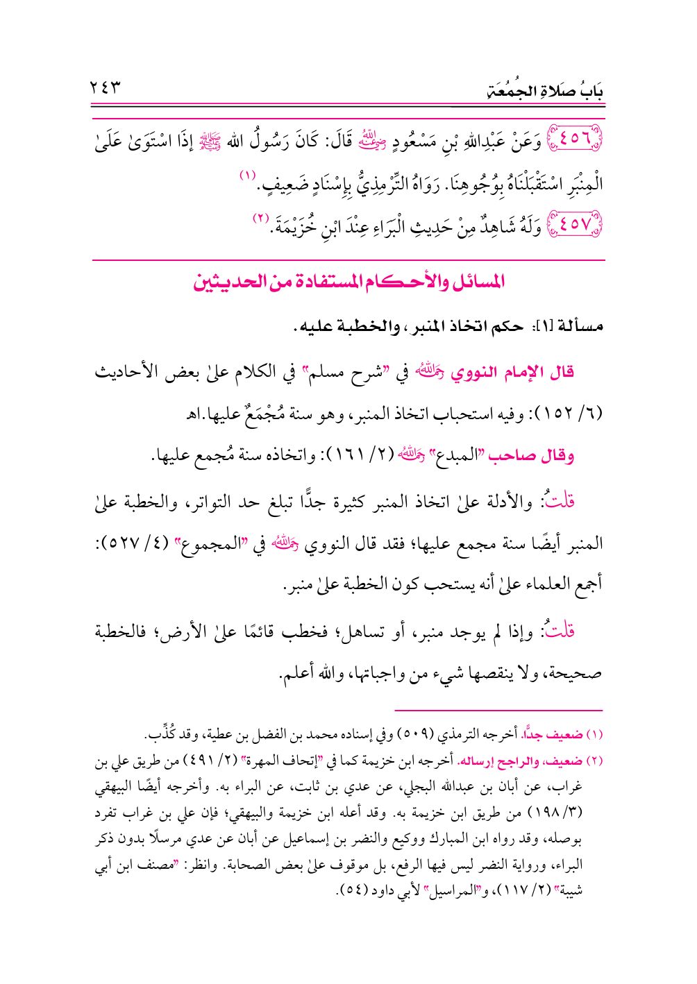 قال أبو عبد الله غفر الله له: أما المسألة الأولى؛ فقد استدل عليها البخاري بحديث أبي سعيد -رضي الله عنه-، وهو في «الصحيحين» (¬١)، قال: جلس النبي - صلى الله عليه وسلم - على المنبر، وجلسنا حوله. وأما المسألة الثانية؛ فالراجح ما ذهب إليه الجمهور، والله أعلم، خلافًا لما ذهب إليه بعض الشافعية.