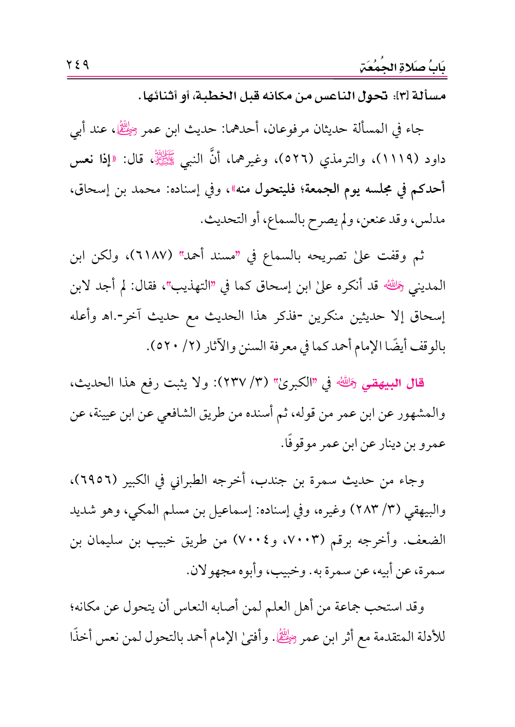 وأقول: الاستحباب حكمٌ شرعي، ولا يثبت إلا بدليل صحيح، ولكن من نعس قبل الخطبة، فأراد التحول لإذهاب النعاس؛ فلا يُنكر عليه، والله أعلم. (¬١)
