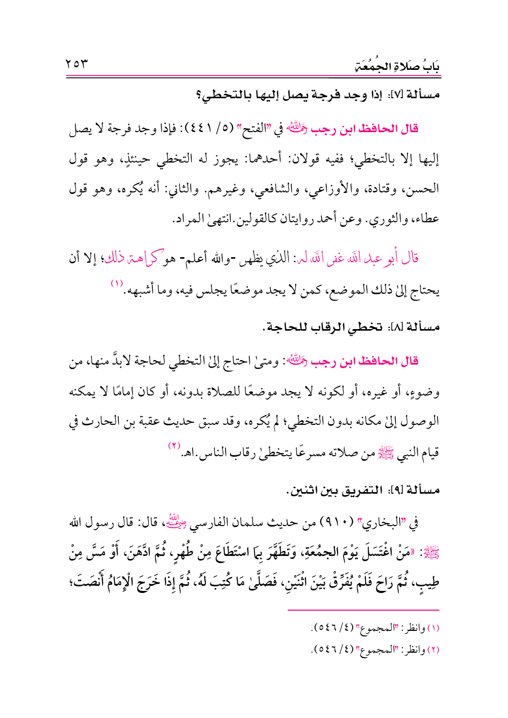 قال الحافظ ابن رجب -رحمه الله- (٩١٠): مما يدخل في التفريق بين اثنين: الجلوس بينهما إن كانا جالسين، أو القيام بينهما أن كانا قائمين في صلاة؛ فإن كان ذلك من غير تضييق عليهما، ولا دفع، ولا أذى، مثل أن يكون بينهما فرجة؛ فإنه يجوز، بل يستحب؛ لأنه مأمور بِسَدِّ الخلل في الصف، وإلَّا فهو منهي عنه، إلَّا أن يأذنا في ذلك. وروى عمرو بن شعيب، عن أبيه، عن جده، أن رسول الله - صلى الله عليه وسلم - قال: «لا يحل للرجل أن يفرق بين اثنين؛ إلا بإذنهما» (¬١)، خرّجه الإمام أحمد، وأبو داود، والترمذي. وقال: حديثٌ حسنٌ. فإن كان الجالسان بينهما قرابة، أو كانا يتحدثان فيما يباح، كان أشد كراهةً. اهـ