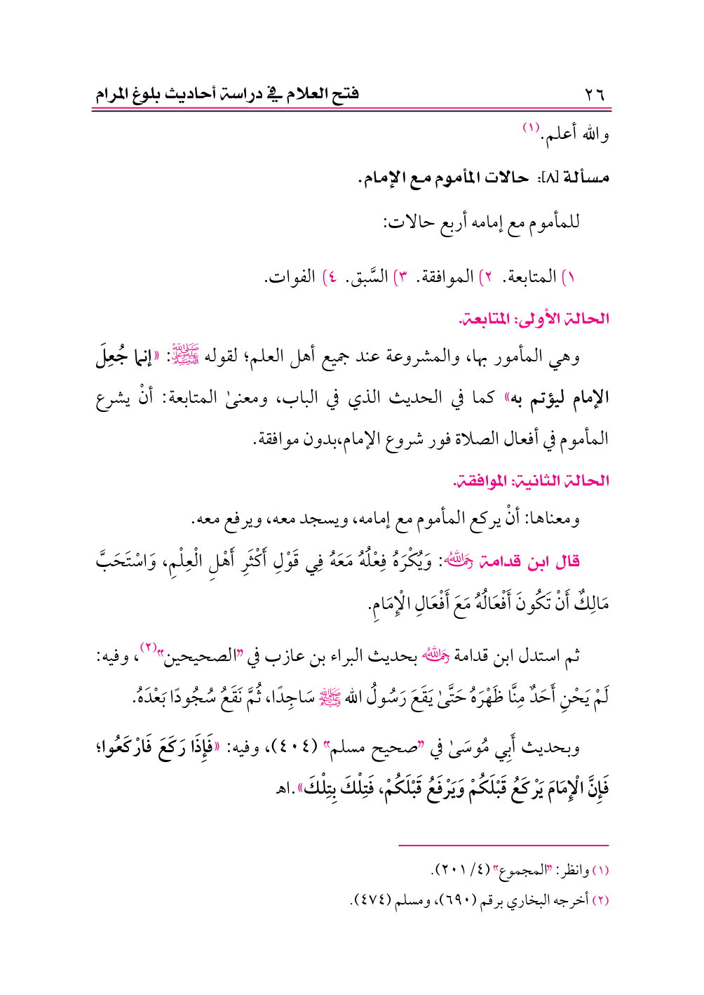 وهي المأمور بها، والمشروعة عند جميع أهل العلم؛ لقوله -صلى الله عليه وعلى آله وسلم-: «إنما جُعِلَ الإمام ليؤتم به» كما في الحديث الذي في الباب، ومعنى المتابعة: أنْ يشرع المأموم في أفعال الصلاة فور شروع الإمام، بدون موافقة.