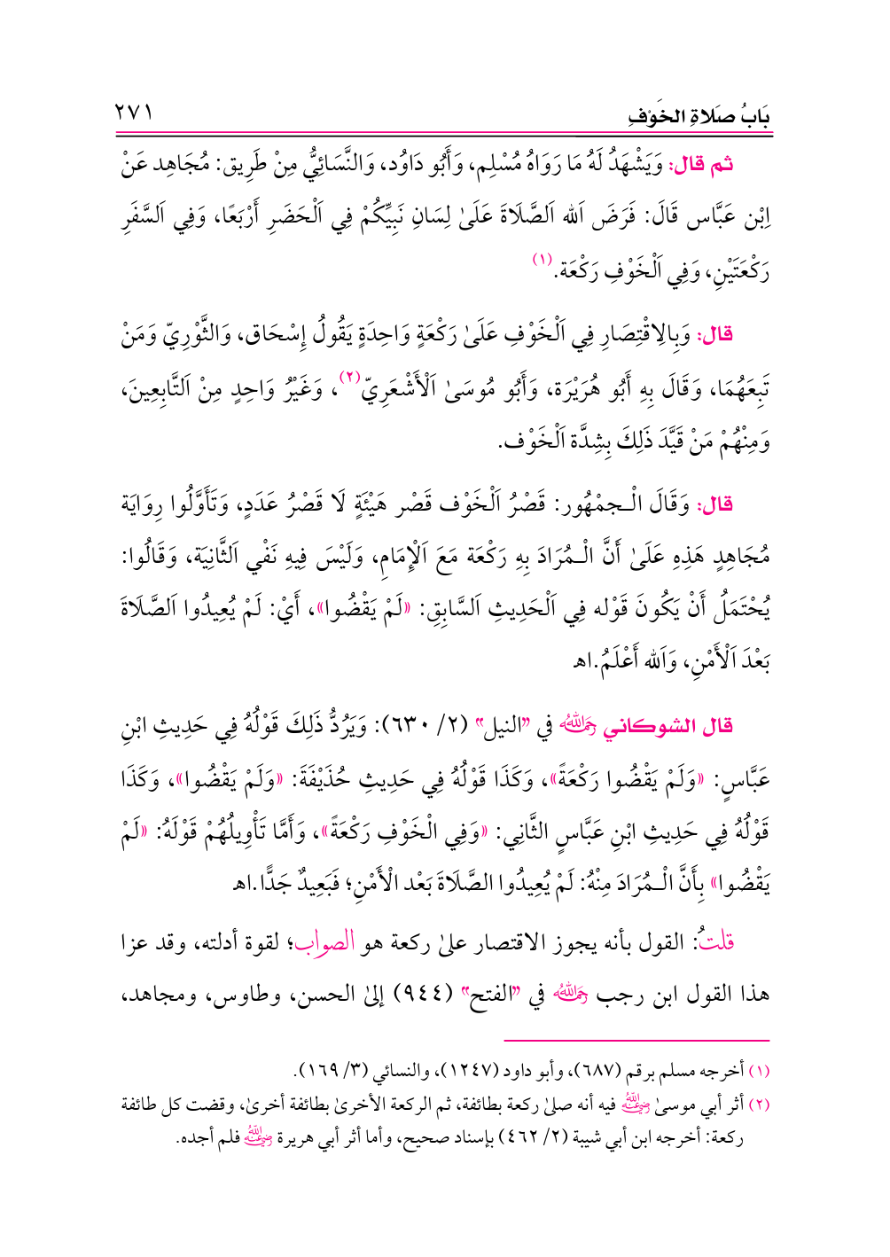 تنبيه وفائدة: نقل ابن رجب -رحمه الله- عن طائفة من أهل العلم أنهم يقولون بجواز الاقتصار على ركعة في الخوف، وقد تقدم ذكرهم، ومنهم: محمد بن نصر المروزي، قال: حتى قاله في صلاة الصبح، مع أنَّ ابن حزم وغيره حَكَوا الإجماع على أنَّ الفجر، والمغرب لا ينقص عن ركعتين، وثلاث في حضر، ولا سفر. ولم يفرِّق هؤلاء -الذين ذكرهم- بين حضرٍ ولا سفر، وهذا يدل على أنهم رأوا قصر الصلاة في الحضر للخوف أشد القصر، وأبلغه، وهو عود الصلوات كلها إلى ركعة، وحُكي رواية عن أحمد. اهـ