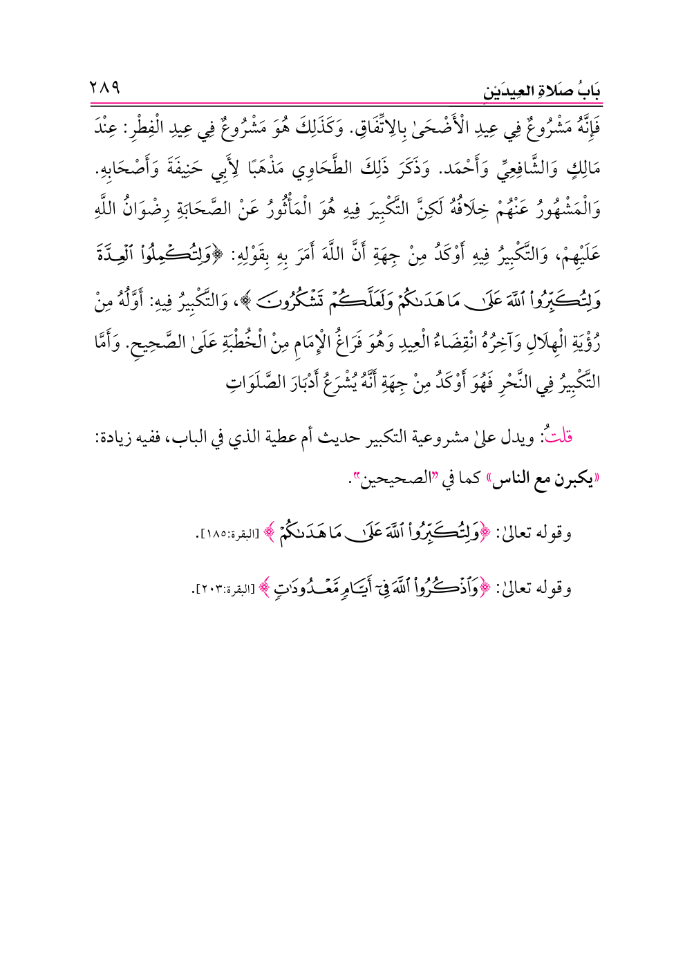 • وذهب طائفة من أهل العلم إلى أنه يبدأ من عند الغُدُوِّ إلى المصلَّى، منهم: مالك، والأوزاعي، وقد عُزي هذا القول للجمهور، وليس بصحيح، والصواب هو القول الأول؛ لأنَّ الله عز وجل ذكر التكبير بعد انتهاء صوم رمضان، وذلك يبدأ من غروب الشمس، والله أعلم. (¬١)