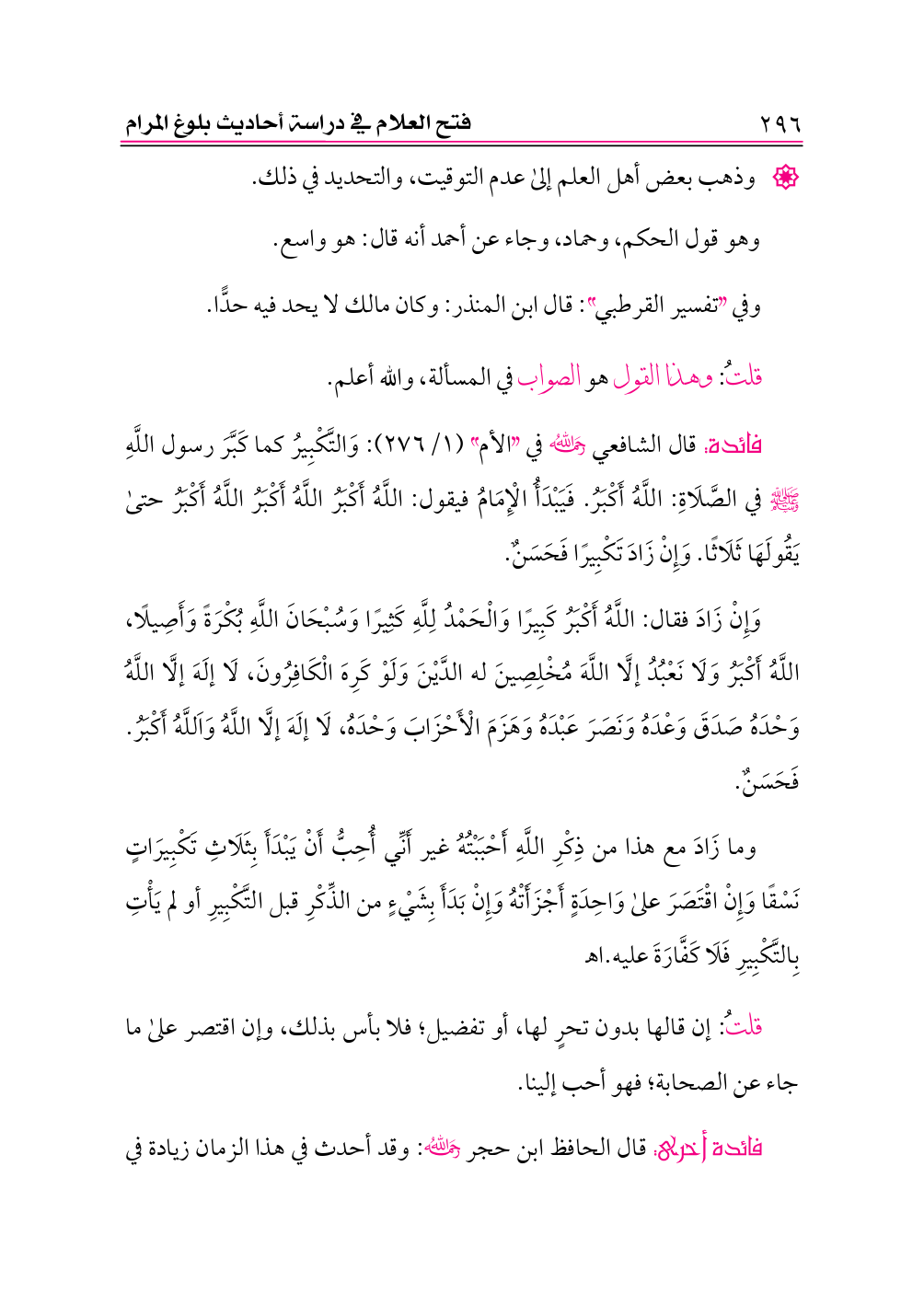 قلتُ: ومن ذلك ما يزيده بعضهم من الصلاة على النبي - صلى الله عليه وسلم - في هذا الموضع، ويكررون ذلك، ولم يفعل ذلك السلف، ولم يستحبه العلماء في هذا الموضع. (¬١)