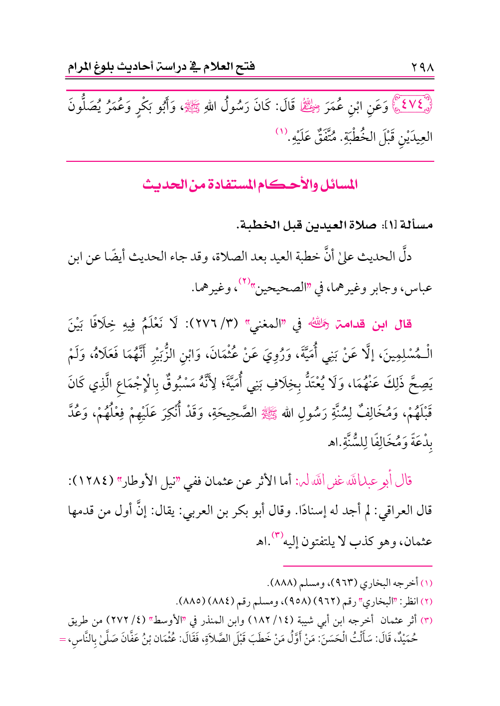 وقد جاء عن عمر -رضي الله عنه- أنه بدأ بالخطبة قبل الصلاة، ففي «مصنف ابن أبي شيبة» (٢/ ١٧١) عن عبدة بن سليمان، عن يحيى بن سعيد، عن يوسف بن عبدالله بن سلام، قال: كان الناس يبدءون بالصلاة ثم يثنون بالخطبة حتى إذا كان عمر، وكثر الناس في زمانه، فكان إذا ذهب يخطب ذهب جفاة الناس، فلما رأى ذلك عمر؛ بدأ بالخطبة حتى ختم بالصلاة.