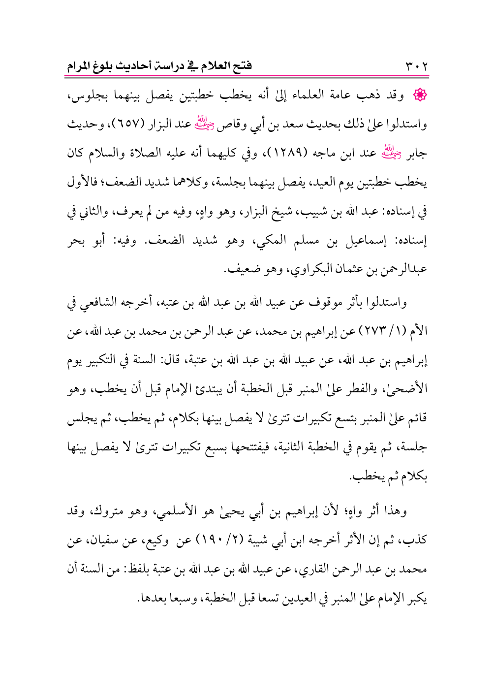 وهذا إسناد صحيح، ومحمد بن عبد الرحمن، صوابه: عبد الرحمن بن محمد ابن عبد الله بن عبد القاري، وهو ثقة، ترجمته في الجرح والتعديل. وهذا اللفظ لا يستفاد منه خطبتان، وقوله: وسبعًا بعدها. يحمل على أنه في آخر الخطبة، والله أعلم.