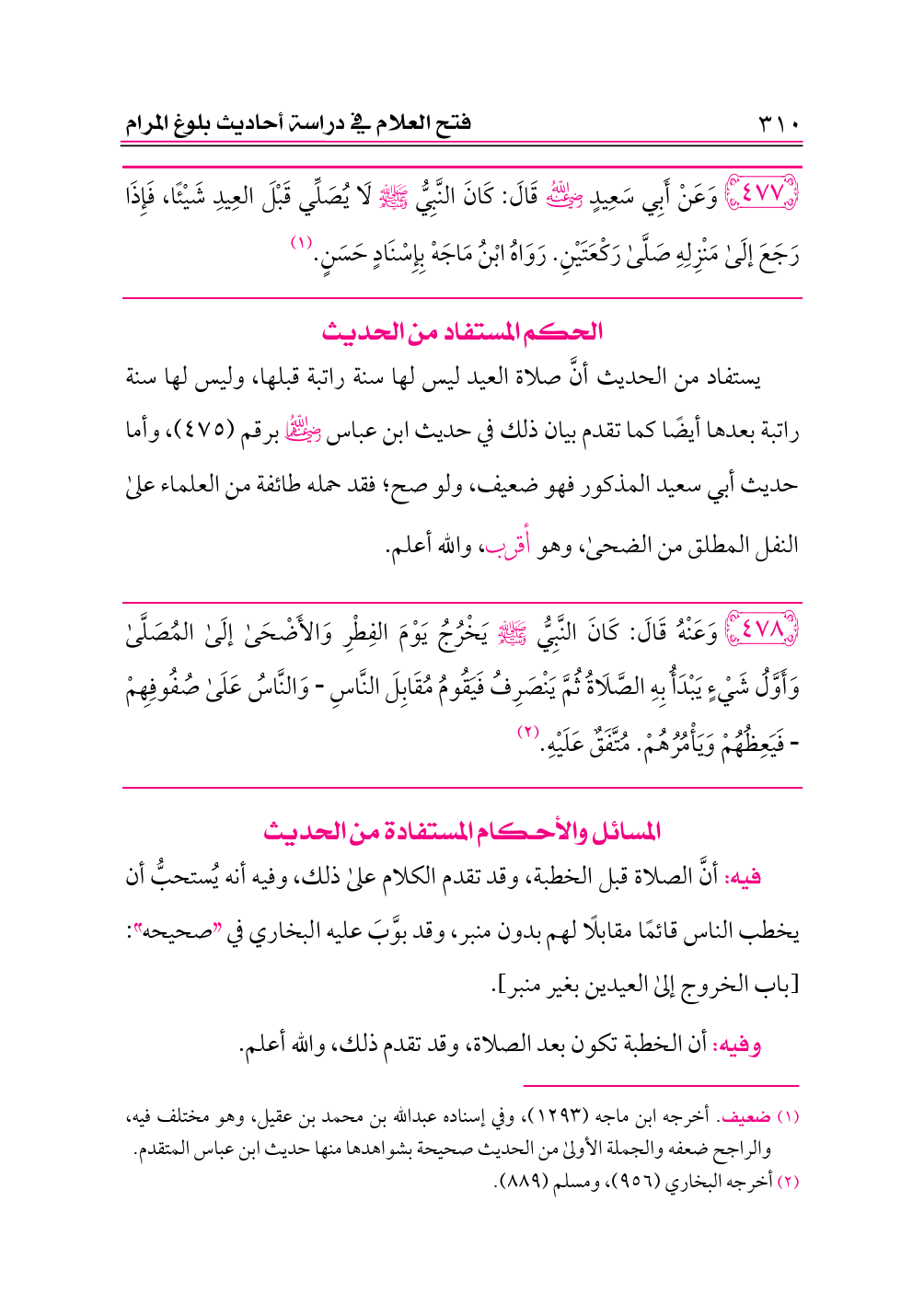 ٤٧٨ - وَعَنْهُ قَالَ: كَانَ النَّبِيُّ - صلى الله عليه وسلم - يَخْرُجُ يَوْمَ الفِطْرِ وَالأَضْحَى إلَى المُصَلَّى وَأَوَّلُ شَيْءٍ يَبْدَأُ بِهِ الصَّلَاةُ ثُمَّ يَنْصَرِفُ فَيَقُومُ مُقَابِلَ النَّاسِ وَالنَّاسُ عَلَى صُفُوفِهِمْ فَيَعِظُهُمْ وَيَأْمُرُهُمْ. مُتَّفَقٌ عَلَيْهِ. (¬١)