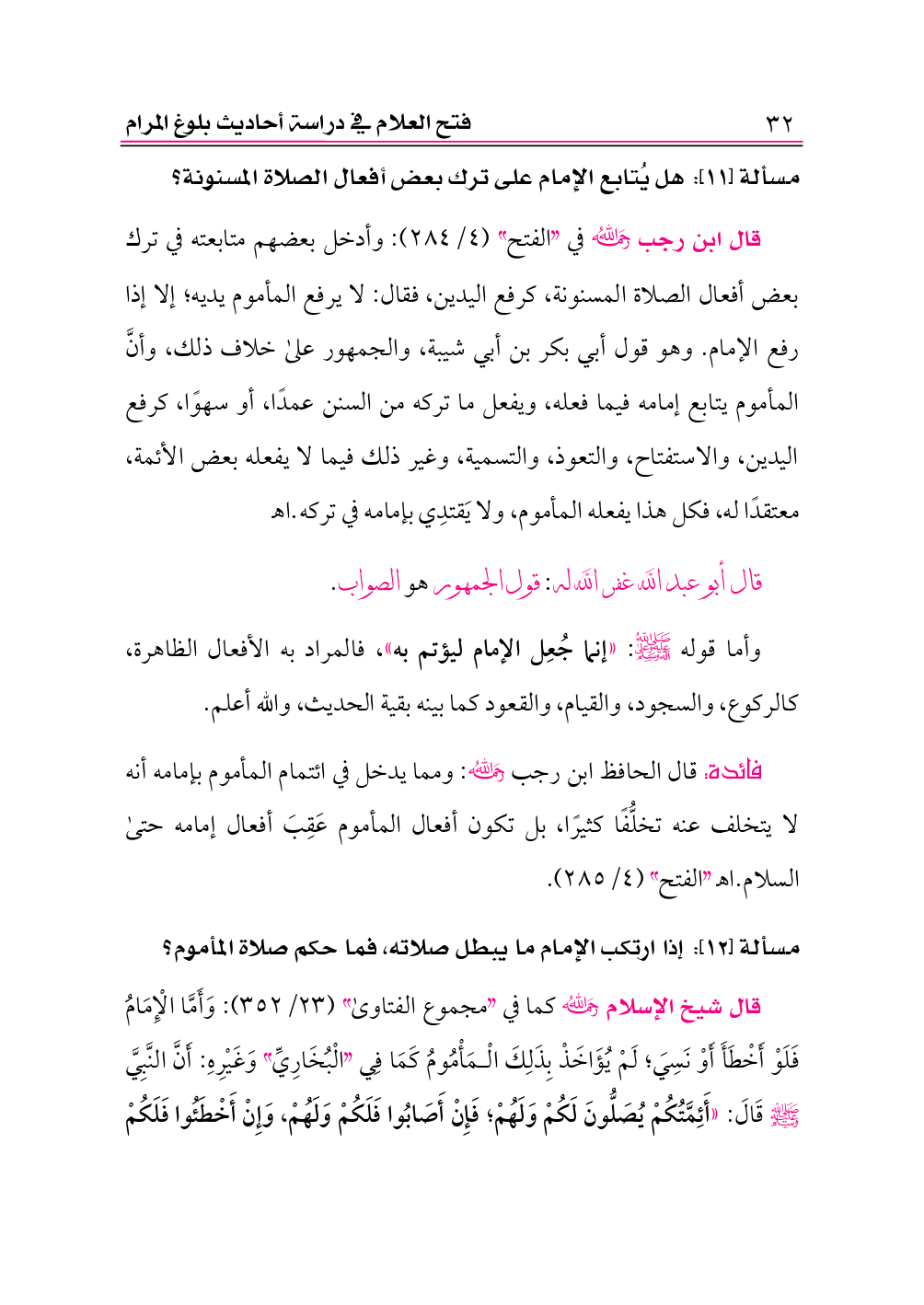 مسألة [١١]: هل يُتابع الإمام على ترك بعض أفعال الصلاة المسنونة؟
