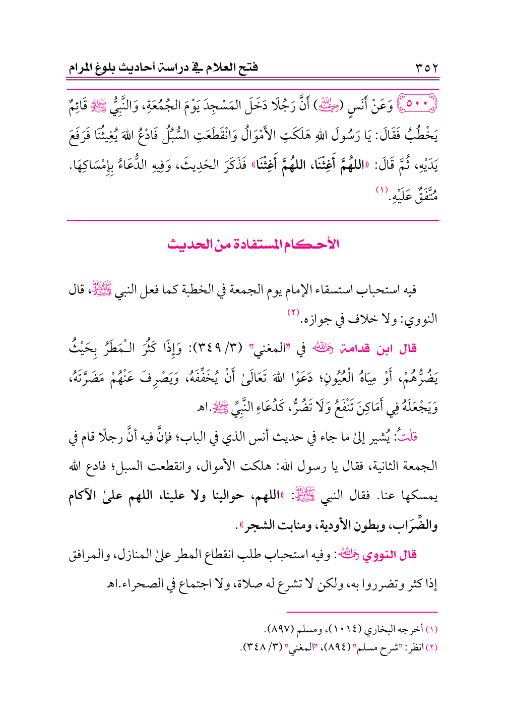 ٥٠١ - وَعَنْهُ أَنَّ عُمَرَ -رضي الله عنه- كَانَ إذَا قُحِطُوا اسْتَسْقَى بِالعَبَّاسِ بْنِ عَبْدِالمُطَّلِبِ، وَقَالَ: اللهُمَّ إنَّا كُنَّا نَسْتَسْقِي إلَيْك بِنَبِيِّنَا فَتَسْقِيَنَا وَإِنَّا نَتَوَسَّلُ إلَيْك بِعَمِّ نَبِيِّنَا فَاسْقِنَا فَيُسْقَوْنَ. رَوَاهُ البُخَارِيُّ. (¬١)