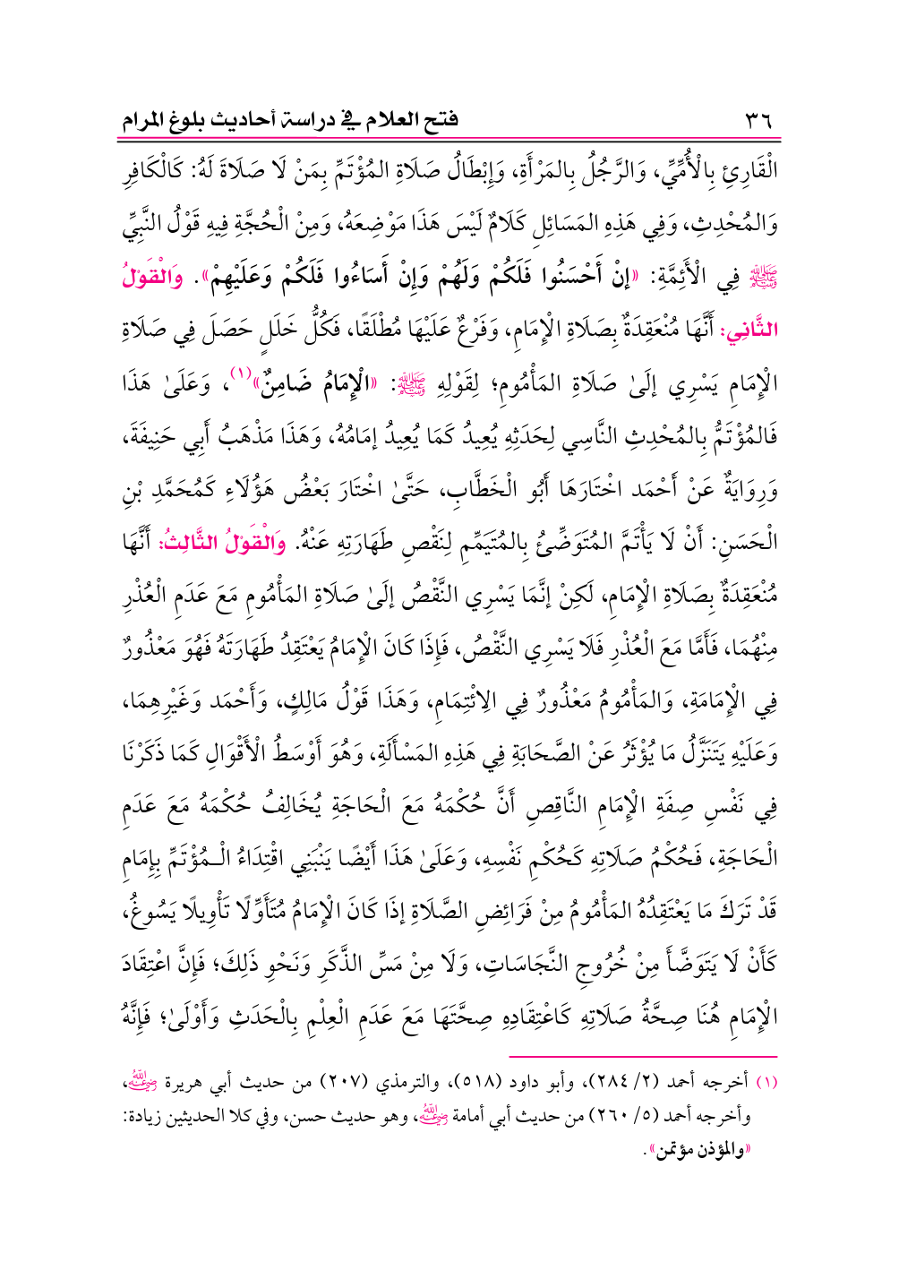 (¬١) أخرجه أحمد (٢/ ٢٨٤)، وأبو داود (٥١٨)، والترمذي (٢٠٧) من حديث أبي هريرة -رضي الله عنه-، وأخرجه أحمد (٥/ ٢٦٠) من حديث أبي أمامة -رضي الله عنه-، وهو حديث حسن، وفي كلا الحديثين زيادة: «والمؤذن مؤتمن».