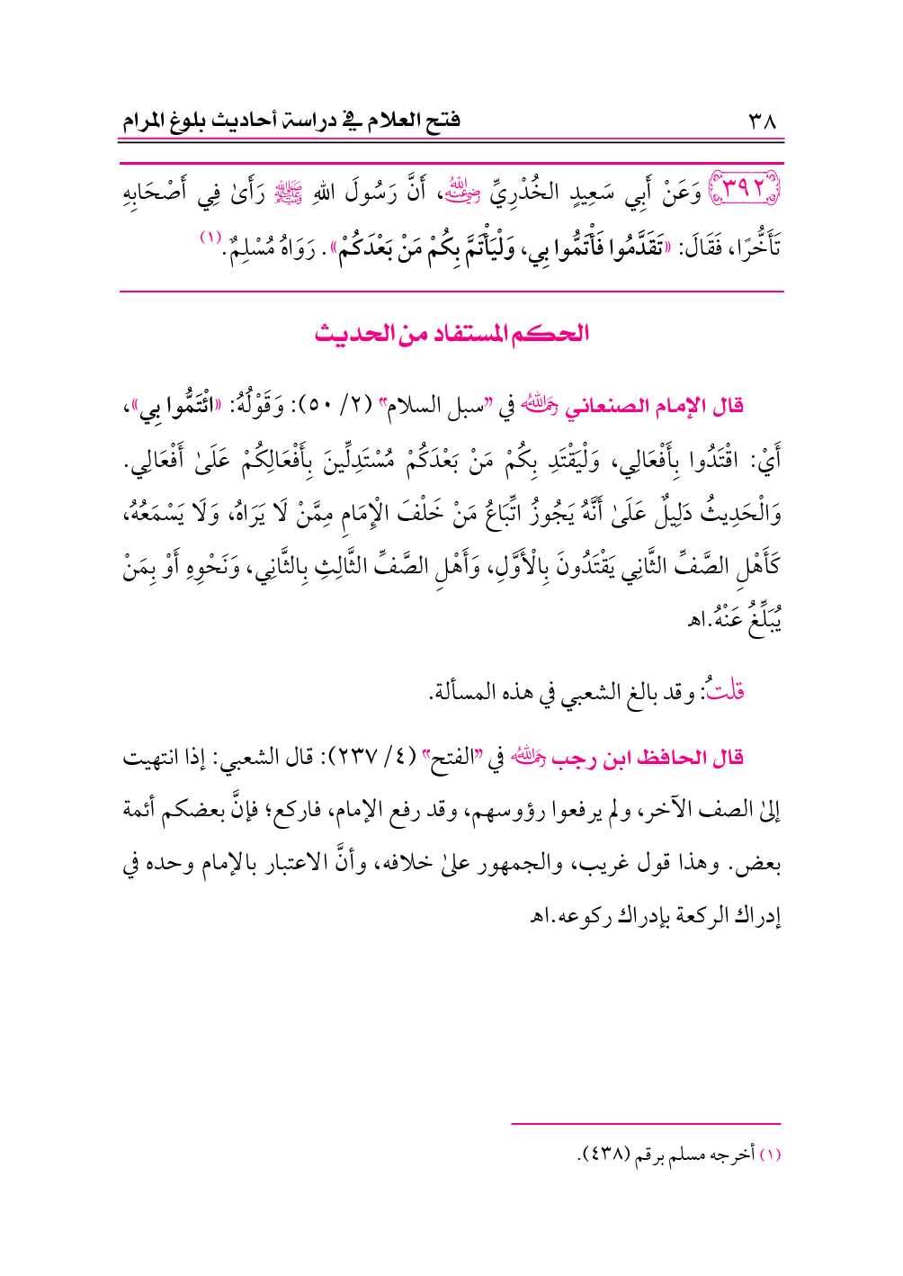 قال الإمام الصنعاني -رحمه الله- في «سبل السلام» (٢/ ٥٠): وَقَوْلُهُ: «ائْتَمُّوا بِي»، أَيْ: اقْتَدُوا بِأَفْعَالِي، وَلْيَقْتَدِ بِكُمْ مَنْ بَعْدَكُمْ مُسْتَدِلِّينَ بِأَفْعَالِكُمْ عَلَى أَفْعَالِي. وَالْحَدِيثُ دَلِيلٌ عَلَى أَنَّهُ يَجُوزُ اتِّبَاعُ مَنْ خَلْفَ الْإِمَامِ مِمَّنْ لَا يَرَاهُ، وَلَا يَسْمَعُهُ، كَأَهْلِ الصَّفِّ الثَّانِي يَقْتَدُونَ بِالْأَوَّلِ، وَأَهْلِ الصَّفِّ الثَّالِثِ بِالثَّانِي، وَنَحْوِهِ أَوْ بِمَنْ يُبَلِّغُ عَنْهُ. اهـ