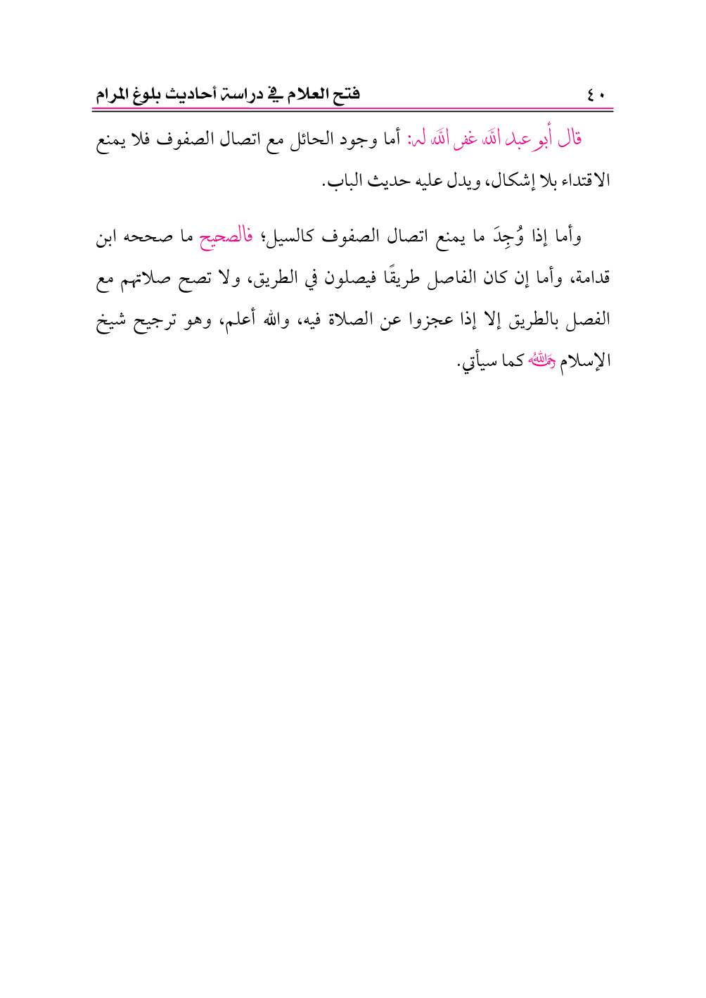 وأما إذا وُجِدَ ما يمنع اتصال الصفوف كالسيل؛ فالصحيح ما صححه ابن قدامة، وأما إن كان الفاصل طريقًا فيصلون في الطريق، ولا تصح صلاتهم مع الفصل بالطريق إلا إذا عجزوا عن الصلاة فيه، والله أعلم، وهو ترجيح شيخ الإسلام -رحمه الله- كما سيأتي.