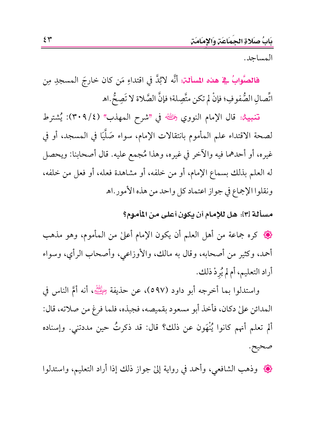 تنبيه: قال الإمام النووي -رحمه الله- في «شرح المهذب» (٤/ ٣٠٩): يُشترط لصحة الاقتداء علم المأموم بانتقالات الإمام، سواء صَلَّيَا في المسجد، أو في غيره، أو أحدهما فيه والآخر في غيره، وهذا مُجمع عليه. قال أصحابنا: ويحصل له العلم بذلك بسماع الإمام، أو من خلفه، أو مشاهدة فعله، أو فعل من خلفه، ونقلوا الإجماع في جواز اعتماد كل واحد من هذه الأمور. اهـ