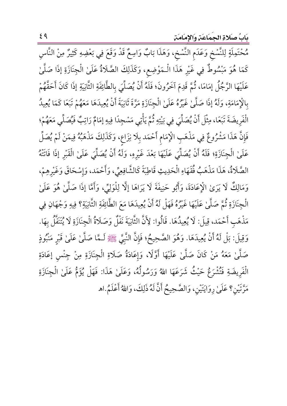 مُحْتَمِلَةٍ لِلنَّسْخِ وَعَدَمِ النَّسْخِ، وَهَذَا بَابٌ وَاسِعٌ قَدْ وَقَعَ فِي بَعْضِهِ كَثِيرٌ مِنْ النَّاسِ كَمَا هُوَ مَبْسُوطٌ فِي غَيْرِ هَذَا الْمَوْضِعِ، وَكَذَلِكَ الصَّلَاةُ عَلَى الْجِنَازَةِ إذَا صَلَّى عَلَيْهَا الرَّجُلُ إمَامًا، ثُمَّ قَدِمَ آخَرُونَ؛ فَلَهُ أَنْ يُصَلِّيَ بِالطَّائِفَةِ الثَّانِيَةِ إذَا كَانَ أَحَقَّهُمْ بِالْإِمَامَةِ، وَلَهُ إذَا صَلَّى غَيْرُهُ عَلَى الْجِنَازَةِ مَرَّةً ثَانِيَةً أَنْ يُعِيدَهَا مَعَهُمْ تَبَعًا كَمَا يُعِيدُ الْفَرِيضَةَ تَبَعًا، مِثْلَ أَنْ يُصَلِّيَ فِي بَيْتِهِ ثُمَّ يَأْتِي مَسْجِدًا فِيهِ إمَامٌ رَاتِبٌ فَيُصَلِّي مَعَهُمْ؛ فَإِنَّ هَذَا مَشْرُوعٌ فِي مَذْهَبِ الْإِمَامِ أَحْمَد بِلَا نِزَاعٍ، وَكَذَلِكَ مَذْهَبُهُ فِيمَنْ لَمْ يُصَلِّ عَلَى الْجِنَازَةِ؛ فَلَهُ أَنْ يُصَلِّيَ عَلَيْهَا بَعْدَ غَيْرِهِ، وَلَهُ أَنْ يُصَلِّيَ عَلَى الْقَبْرِ إذَا فَاتَتْهُ الصَّلَاةُ، هَذَا مَذْهَبُ فُقَهَاءِ الْحَدِيثِ قَاطِبَةً كَالشَّافِعِيِّ، وَأَحْمَد، وَإِسْحَاقَ وَغَيْرِهِمْ، وَمَالِكٌ لَا يَرَى الْإِعَادَةَ، وَأَبُو حَنِيفَةَ لَا يَرَاهَا إلَّا لِلْوَلِيِّ، وَأَمَّا إذَا صَلَّى هُوَ عَلَى الْجِنَازَةِ ثُمَّ صَلَّى عَلَيْهَا غَيْرُهُ فَهَلْ لَهُ أَنْ يُعِيدَهَا مَعَ الطَّائِفَةِ الثَّانِيَةِ؟ فِيهِ وَجْهَانِ فِي مَذْهَبِ أَحْمَد، قِيلَ: لَا يُعِيدُهَا. قَالُوا: لِأَنَّ الثَّانِيَةَ نَفْلٌ وَصَلَاةُ الْجِنَازَةِ لَا يُتَنَفَّلُ بِهَا. وَقِيلَ: بَلْ لَهُ أَنْ يُعِيدَهَا.
