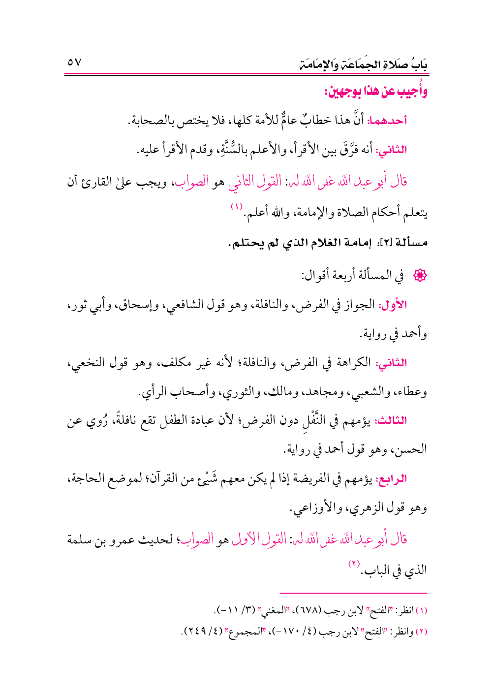 قال أبو عبد الله غفر الله له: القول الأول هو الصواب؛ لحديث عمرو بن سلمة الذي في الباب. (¬٢)