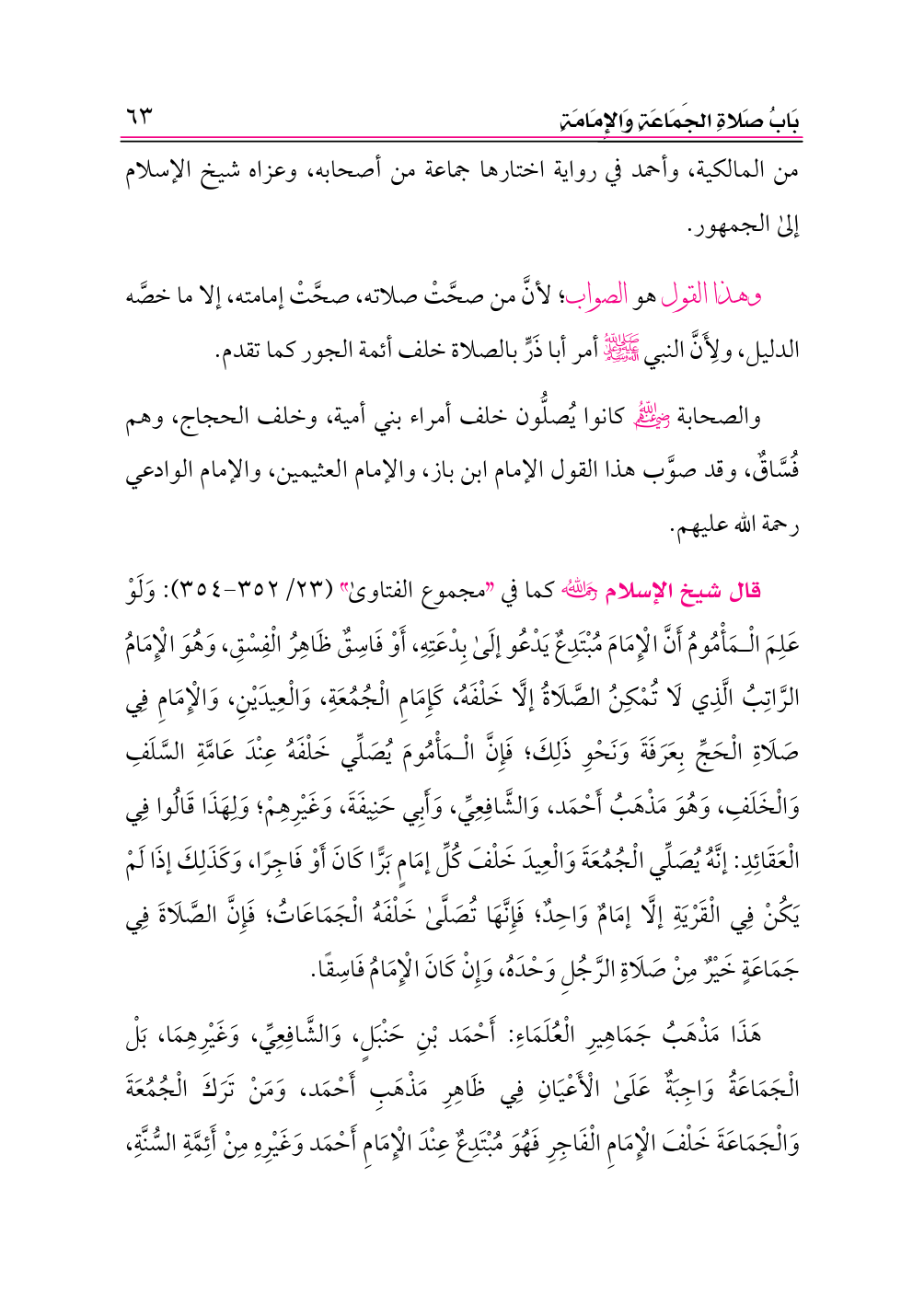 هَذَا مَذْهَبُ جَمَاهِيرِ الْعُلَمَاءِ: أَحْمَد بْنِ حَنْبَلٍ، وَالشَّافِعِيِّ، وَغَيْرِهِمَا، بَلْ الْجَمَاعَةُ وَاجِبَةٌ عَلَى الْأَعْيَانِ فِي ظَاهِرِ مَذْهَبِ أَحْمَد، وَمَنْ تَرَكَ الْجُمُعَةَ وَالْجَمَاعَةَ خَلْفَ الْإِمَامِ الْفَاجِرِ فَهُوَ مُبْتَدِعٌ عِنْدَ الْإِمَامِ أَحْمَد وَغَيْرِهِ مِنْ أَئِمَّةِ السُّنَّةِ،