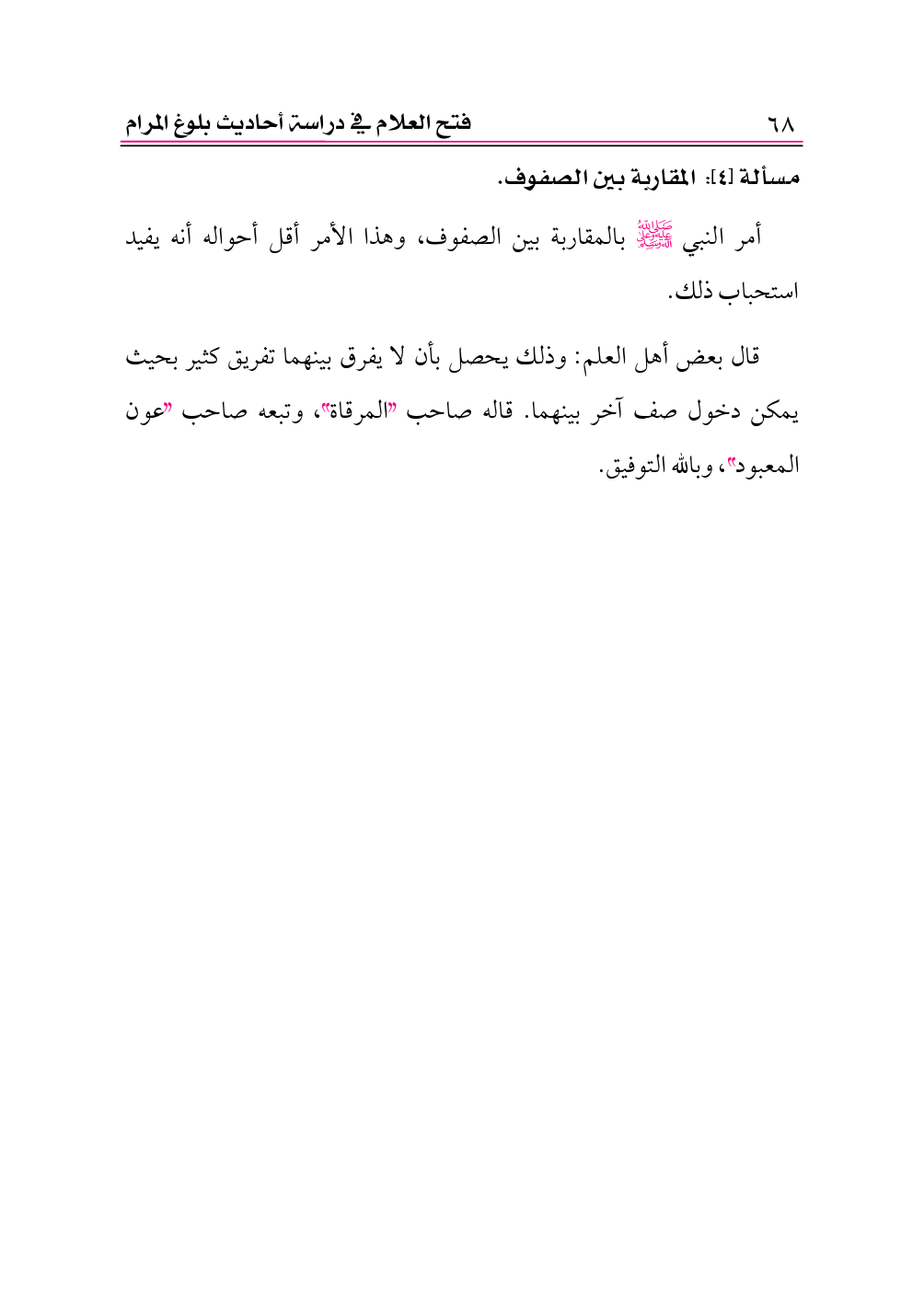 قال بعض أهل العلم: وذلك يحصل بأن لا يفرق بينهما تفريق كثير بحيث يمكن دخول صف آخر بينهما. قاله صاحب «المرقاة»، وتبعه صاحب «عون المعبود»، وبالله التوفيق.