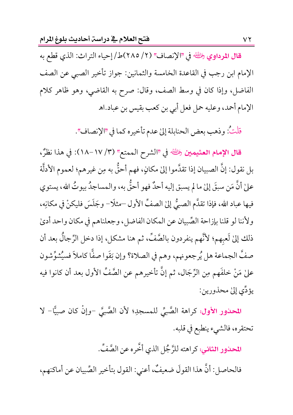 قال الإمام العثيمين -رحمه الله- في «الشرح الممتع» (٣/ ١٧ - ١٨): في هذا نظرٌ، بل نقول: إنَّ الصبيان إذا تقدَّموا إلى مكانٍ، فهم أحقُّ به مِن غيرهم؛ لعموم الأدلَّة على أنَّ مَن سبقَ إلى ما لم يسبق إليه أحدٌ فهو أحقُّ به، والمساجدُ بيوتُ الله، يستوي فيها عباد الله، فإذا تقدَّم الصبيُّ إلى الصفِّ الأول -مثلًا- وجَلَسَ فليكنْ في مكانِه، ولأننا لو قلنا بإزاحة الصِّبيان عن المكان الفاضل، وجعلناهم في مكان واحد أدى ذلك إلى لَعبِهم؛ لأنَّهم ينفردون بالصَّفِّ، ثم هنا مشكل، إذا دخل الرِّجالُ بعد أن صفَّ الجماعة هل يُرجعونهم، وهم في الصلاة؟ وإن بَقَوا صفًّا كاملاً فسيُشوِّشون على مَنْ خلفَهم مِن الرِّجَال، ثم إنَّ تأخيرهم عن الصَّفِّ الأول بعد أن كانوا فيه يؤدِّي إلى محذورين: