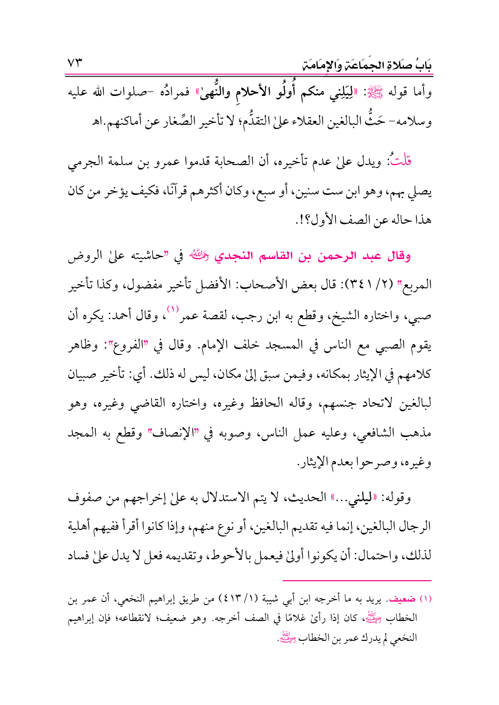 قلتُ: ويدل على عدم تأخيره، أن الصحابة قدموا عمرو بن سلمة الجرمي يصلي بهم، وهو ابن ست سنين، أو سبع، وكان أكثرهم قرآنًا، فكيف يؤخر من كان هذا حاله عن الصف الأول؟!.