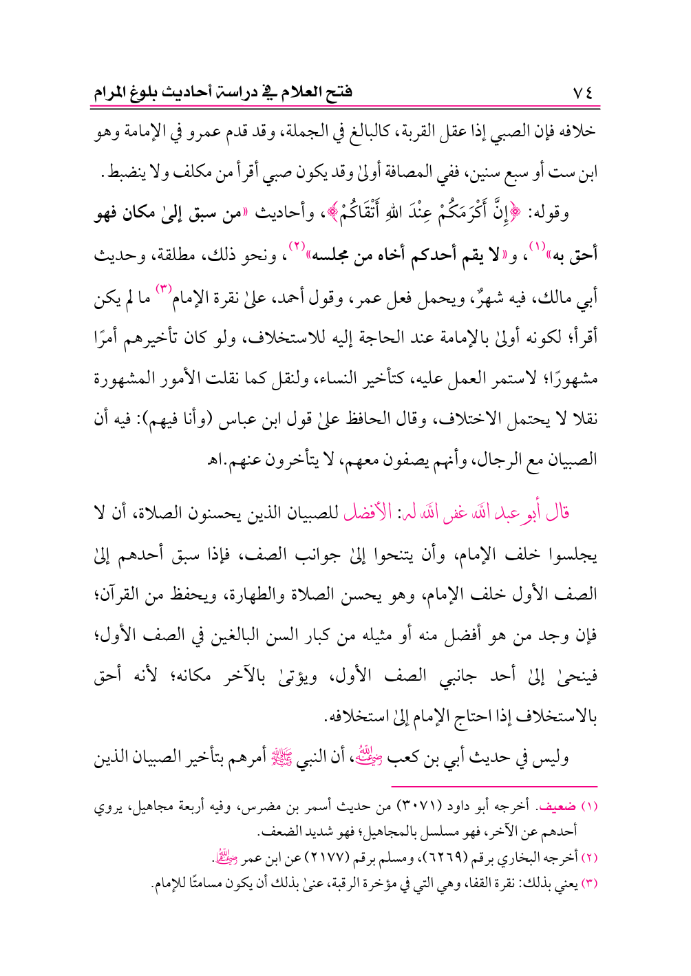 وقوله: {إِنَّ أَكْرَمَكُمْ عِنْدَ اللهِ أَتْقَاكُمْ}، وأحاديث «من سبق إلى مكان فهو أحق به» (¬١)، و «لا يقم أحدكم أخاه من مجلسه» (¬٢)، ونحو ذلك، مطلقة، وحديث أبي مالك، فيه شهرٌ، ويحمل فعل عمر، وقول أحمد، على نقرة الإمام (¬٣) ما لم يكن أقرأ؛ لكونه أولى بالإمامة عند الحاجة إليه للاستخلاف، ولو كان تأخيرهم أمرًا مشهورًا؛ لاستمر العمل عليه، كتأخير النساء، ولنقل كما نقلت الأمور المشهورة نقلا لا يحتمل الاختلاف، وقال الحافظ على قول ابن عباس (وأنا فيهم): فيه أن الصبيان مع الرجال، وأنهم يصفون معهم، لا يتأخرون عنهم. اهـ