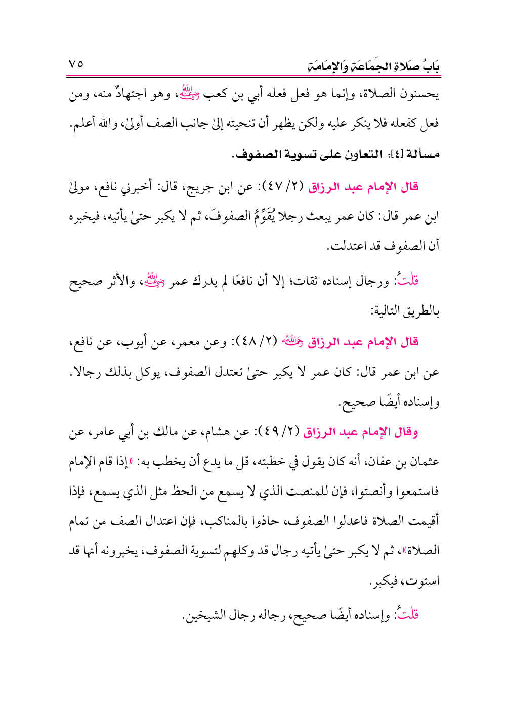 قال الإمام عبد الرزاق -رحمه الله- (٢/ ٤٨): وعن معمر، عن أيوب، عن نافع، عن ابن عمر قال: كان عمر لا يكبر حتى تعتدل الصفوف، يوكل بذلك رجالا. وإسناده أيضًا صحيح.