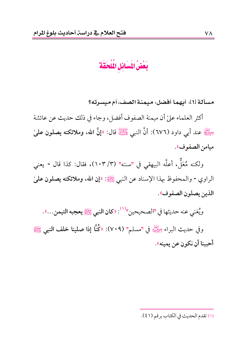 وفي حديث البراء -رضي الله عنه- في «مسلم» (٧٠٩): «كُنَّا إذا صلينا خلف النبي - صلى الله عليه وسلم - أحببنا أن نكون عن يمينه».