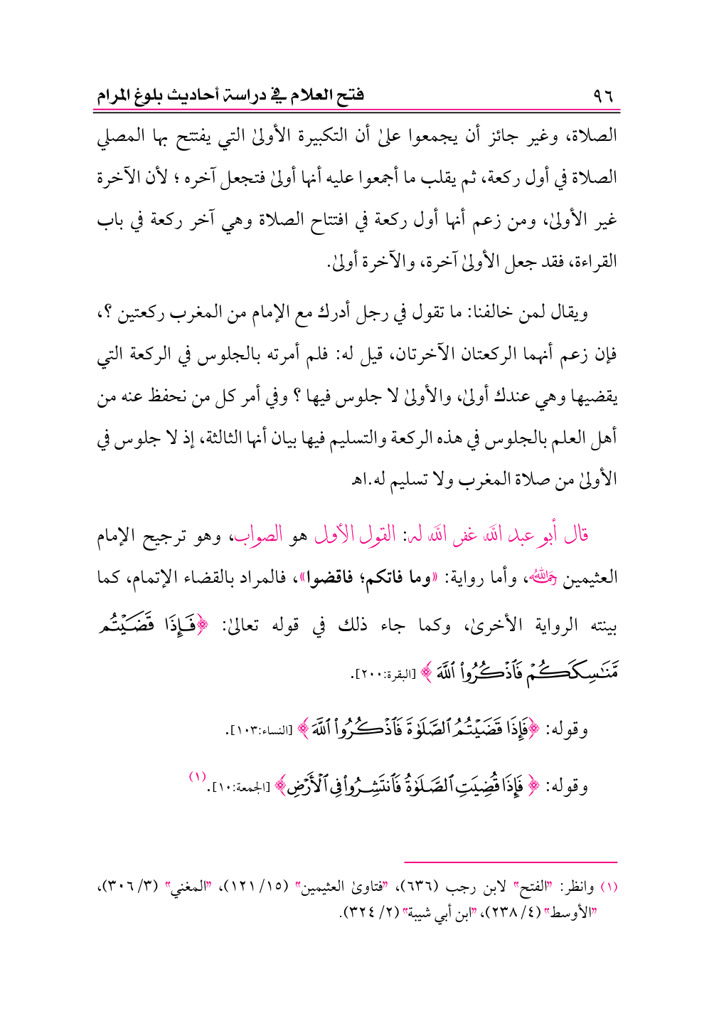 قال أبو عبد الله غفر الله له: القول الأول هو الصواب، وهو ترجيح الإمام العثيمين -رحمه الله-، وأما رواية: «وما فاتكم؛ فاقضوا»، فالمراد بالقضاء الإتمام، كما بينته الرواية الأخرى، وكما جاء ذلك في قوله تعالى: {فَإِذَا قَضَيْتُمْ مَنَاسِكَكُمْ فَاذْكُرُوا اللَّهَ} [البقرة:٢٠٠].