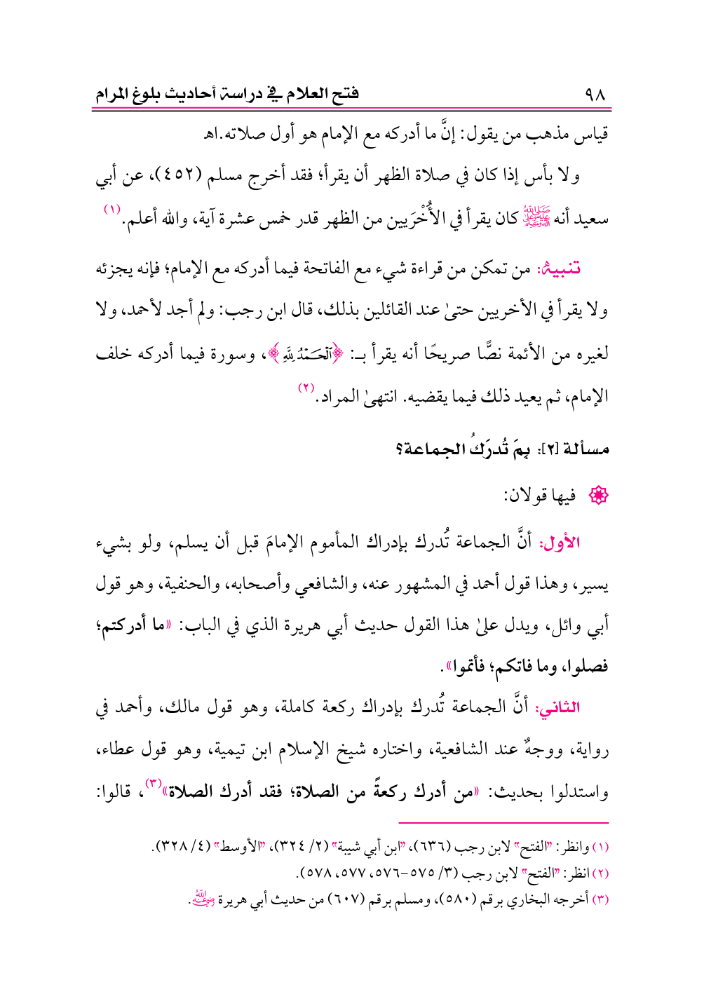 تنبيه: من تمكن من قراءة شيء مع الفاتحة فيما أدركه مع الإمام؛ فإنه يجزئه ولا يقرأ في الأخريين حتى عند القائلين بذلك، قال ابن رجب: ولم أجد لأحمد، ولا لغيره من الأئمة نصًّا صريحًا أنه يقرأ بـ: {الْحَمْدُ لِلَّهِ}، وسورة فيما أدركه خلف الإمام، ثم يعيد ذلك فيما يقضيه. انتهى المراد. (¬٢)