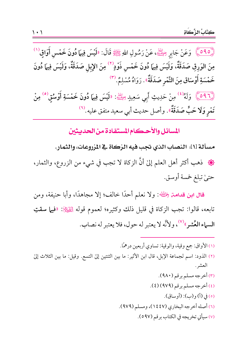 ٥٩٥ - وَعَنْ جَابِرٍ -رضي الله عنه-، عَنْ رَسُولِ اللهِ - صلى الله عليه وسلم - قَالَ: «لَيْسَ فِيمَا دُونَ خَمْسِ أَوَاقٍ (¬١) مِنَ الوَرِقِ صَدَقَةٌ، وَلَيْسَ فِيمَا دُونَ خَمْسِ ذَوْدٍ (¬٢) مِنَ الإِبِلِ صَدَقَةٌ، وَلَيْسَ فِيمَا دُونَ خَمْسَةِ أَوْسَاق مِنَ التَّمْرِ صَدَقَةٌ». رَوَاهُ مُسْلِمٌ. (¬٣)