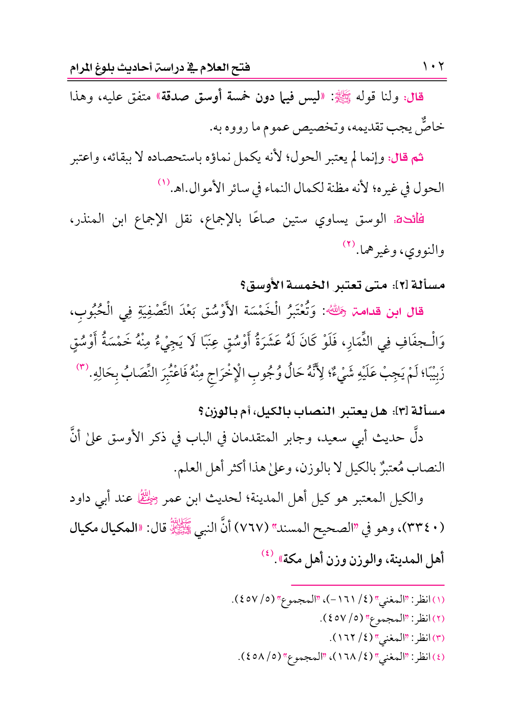فائدة: الوسق يساوي ستين صاعًا بالإجماع، نقل الإجماع ابن المنذر، والنووي، وغيرهما. (¬٢)