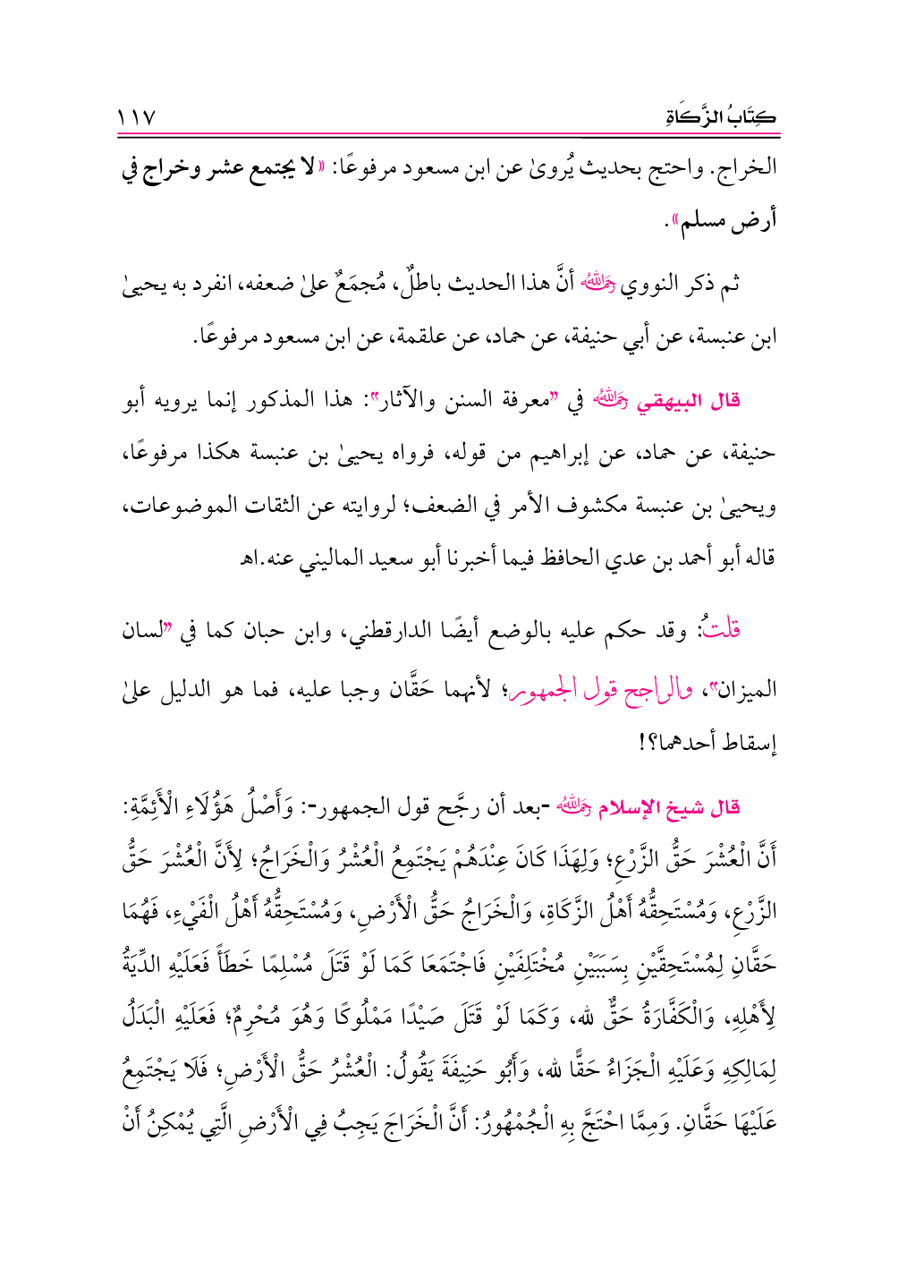قال شيخ الإسلام -رحمه الله- بعد أن رجَّح قول الجمهور: وَأَصْلُ هَؤُلَاءِ الْأَئِمَّةِ: أَنَّ الْعُشْرَ حَقُّ الزَّرْعِ؛ وَلِهَذَا كَانَ عِنْدَهُمْ يَجْتَمِعُ الْعُشْرُ وَالْخَرَاجُ؛ لِأَنَّ الْعُشْرَ حَقُّ الزَّرْعِ، وَمُسْتَحِقُّهُ أَهْلُ الزَّكَاةِ، وَالْخَرَاجُ حَقُّ الْأَرْضِ، وَمُسْتَحِقُّهُ أَهْلُ الْفَيْءِ، فَهُمَا حَقَّانِ لِمُسْتَحِقَّيْنِ بِسَبَبَيْنِ مُخْتَلِفَيْنِ فَاجْتَمَعَا كَمَا لَوْ قَتَلَ مُسْلِمًا خَطَأً فَعَلَيْهِ الدِّيَةُ لِأَهْلِهِ، وَالْكَفَّارَةُ حَقٌّ لله، وَكَمَا لَوْ قَتَلَ صَيْدًا مَمْلُوكًا وَهُوَ مُحْرِمٌ؛ فَعَلَيْهِ الْبَدَلُ لِمَالِكِهِ وَعَلَيْهِ الْجَزَاءُ حَقًّا لله، وَأَبُو حَنِيفَةَ يَقُولُ: الْعُشْرُ حَقُّ الْأَرْضِ؛ فَلَا يَجْتَمِعُ عَلَيْهَا حَقَّانِ. وَمِمَّا احْتَجَّ بِهِ الْجُمْهُورُ: أَنَّ الْخَرَاجَ يَجِبُ فِي الْأَرْضِ الَّتِي يُمْكِنُ أَنْ