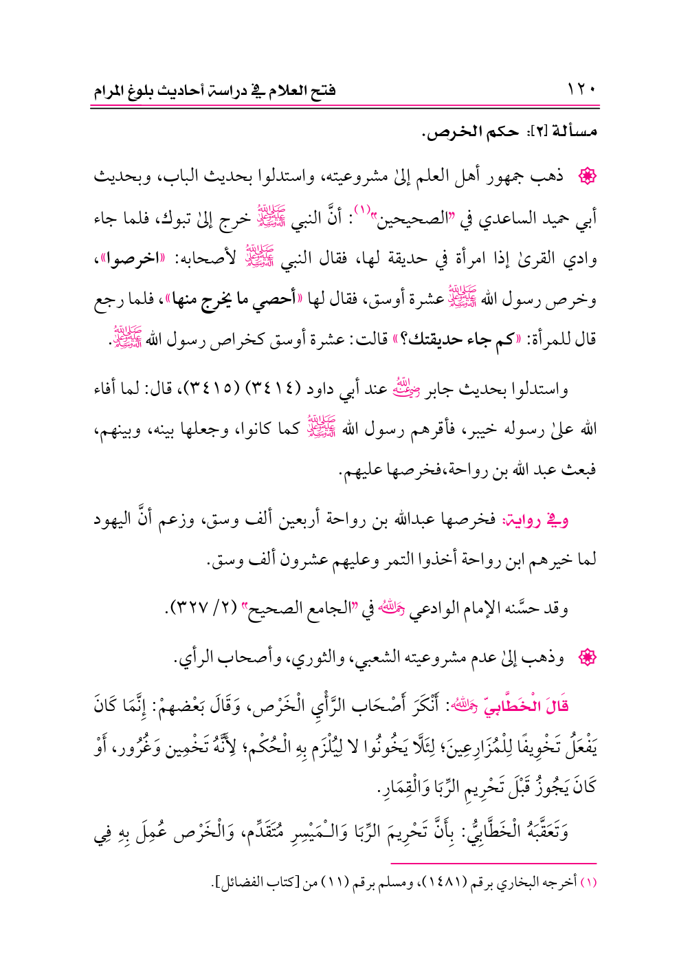 • ذهب جمهور أهل العلم إلى مشروعيته، واستدلوا بحديث الباب، وبحديث أبي حميد الساعدي في «الصحيحين» (¬١): أنَّ النبي -صلى الله عليه وعلى آله وسلم- خرج إلى تبوك، فلما جاء وادي القرى إذا امرأة في حديقة لها، فقال النبي -صلى الله عليه وعلى آله وسلم- لأصحابه: «اخرصوا»، وخرص رسول الله -صلى الله عليه وعلى آله وسلم- عشرة أوسق، فقال لها «أحصي ما يخرج منها»، فلما رجع قال للمرأة: «كم جاء حديقتك؟» قالت: عشرة أوسق كخراص رسول الله -صلى الله عليه وعلى آله وسلم-.
