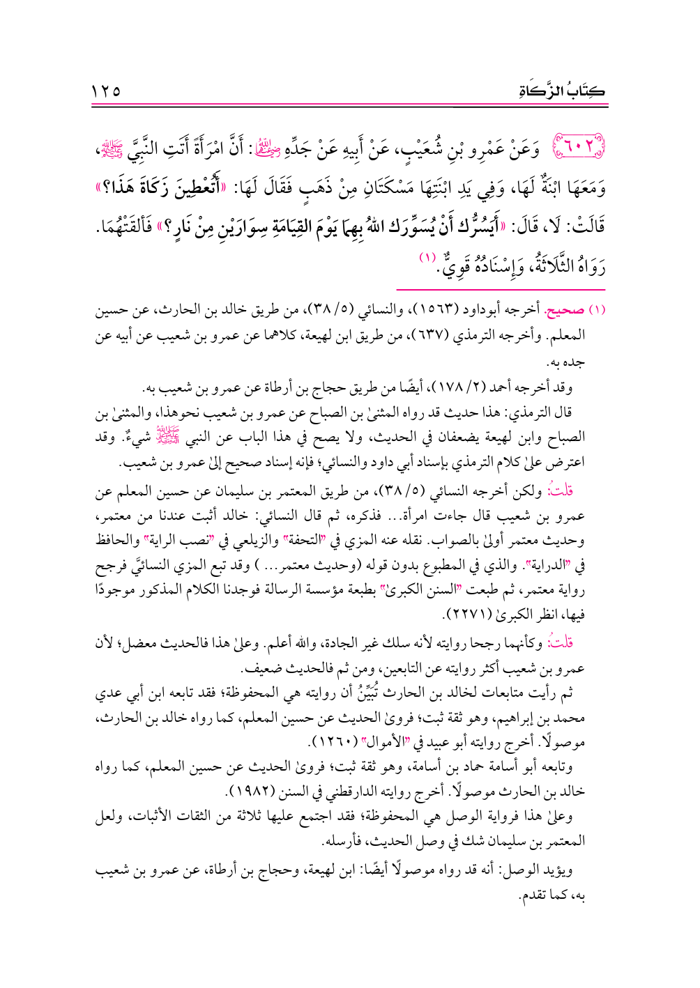 قلتُ: ولكن أخرجه النسائي (٥/ ٣٨)، من طريق المعتمر بن سليمان عن حسين المعلم عن عمرو بن شعيب قال جاءت امرأة ... فذكره، ثم قال النسائي: خالد أثبت عندنا من معتمر، وحديث معتمر أولى بالصواب. نقله عنه المزي في «التحفة» والزيلعي في «نصب الراية» والحافظ في «الدراية». والذي في المطبوع بدون قوله (وحديث معتمر ... ) وقد تبع المزي النسائيَّ فرجح رواية معتمر، ثم طبعت «السنن الكبرى» بطبعة مؤسسة الرسالة فوجدنا الكلام المذكور موجودًا فيها، انظر الكبرى (٢٢٧١).