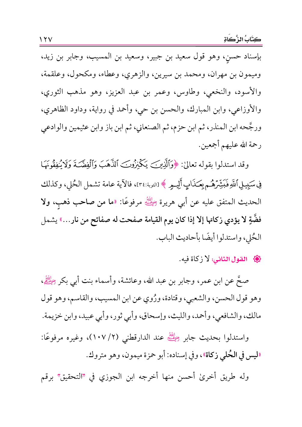 بإسناد حسنٍ، وهو قول سعيد بن جبير، وسعيد بن المسيب، وجابر بن زيد، وميمون بن مهران، ومحمد بن سيرين، والزهري، وعطاء، ومكحول، وعلقمة، والأسود، والنخعي، وطاوس، وعمر بن عبد العزيز، وهو مذهب الثوري، والأوزاعي، وابن المبارك، والحسن بن حي، وأحمد في رواية، وداود الظاهري، ورجَّحه ابن المنذر، ثم ابن حزم، ثم الصنعاني، ثم ابن باز وابن عثيمين والوادعي رحمة الله عليهم أجمعين.