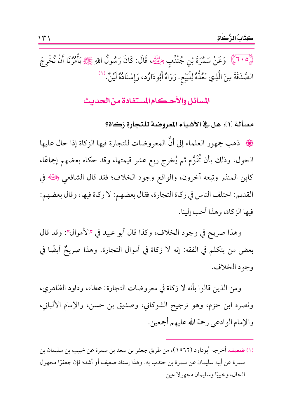 ٦٠٥ - وَعَنْ سَمُرَةَ بْنِ جُنْدُبٍ -رضي الله عنه-، قَالَ: كَانَ رَسُولُ اللهِ - صلى الله عليه وسلم - يَأْمُرُنَا أَنْ نُخْرِجَ الصَّدَقَةَ مِنَ الَّذِي نَعُدُّهُ لِلْبَيْعِ. رَوَاهُ أَبُودَاوُد، وَإِسْنَادُهُ لَيِّنٌ. (¬١)