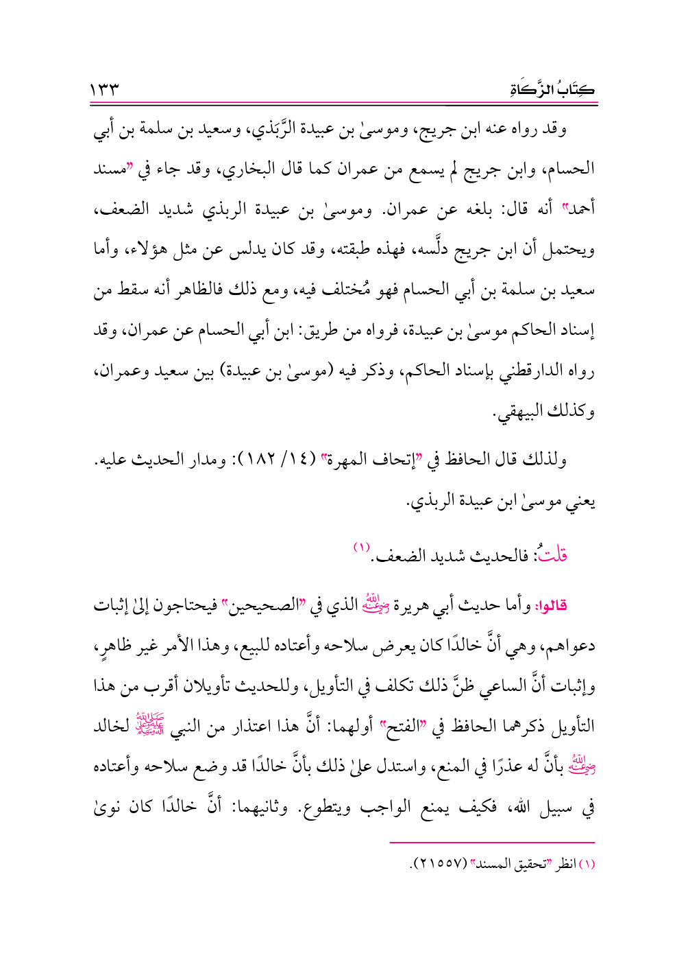 قالوا: وأما حديث أبي هريرة -رضي الله عنه- الذي في «الصحيحين» فيحتاجون إلى إثبات دعواهم، وهي أنَّ خالدًا كان يعرض سلاحه وأعتاده للبيع، وهذا الأمر غير ظاهرٍ، وإثبات أنَّ الساعي ظنَّ ذلك تكلف في التأويل، وللحديث تأويلان أقرب من هذا التأويل ذكرهما الحافظ في «الفتح» أولهما: أنَّ هذا اعتذار من النبي -صلى الله عليه وعلى آله وسلم- لخالد -رضي الله عنه- بأنَّ له عذرًا في المنع، واستدل على ذلك بأنَّ خالدًا قد وضع سلاحه وأعتاده في سبيل الله، فكيف يمنع الواجب ويتطوع. وثانيهما: أنَّ خالدًا كان نوى