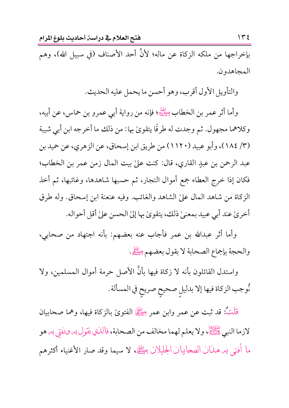 وأما أثر عمر بن الخطاب -رضي الله عنه-؛ فإنه من رواية أبي عمرو بن حماس، عن أبيه، وكلاهما مجهول. ثم وجدت له طرقًا يتقوى بها: من ذلك ما أخرجه ابن أبي شيبة (٣/ ١٨٤)، وأبو عبيد (١١٢٠) من طريق ابن إسحاق، عن الزهري، عن حميد بن عبد الرحمن بن عبدٍ القاري، قال: كنت على بيت المال زمن عمر بن الخطاب؛ فكان إذا خرج العطاء جمع أموال التجار، ثم حسبها شاهدها، وغائبها، ثم أخذ الزكاة من شاهد المال على الشاهد والغائب. وفيه عنعنة ابن إسحاق. وله طرق أخرى عند أبي عبيد بمعنى ذلك، يتقوى بها إلى الحسن على أقل أحواله.