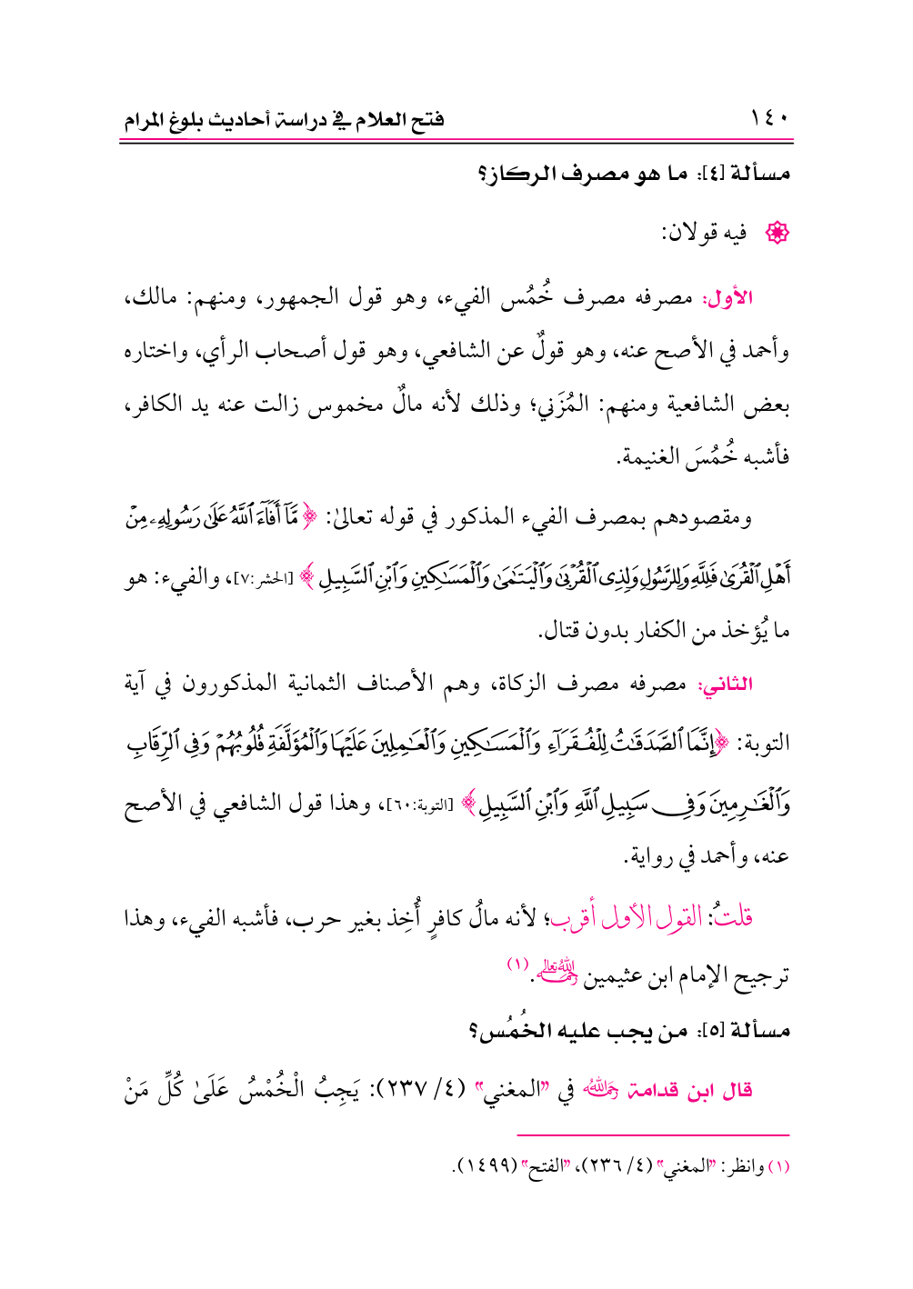 ومقصودهم بمصرف الفيء المذكور في قوله تعالى: {مَا أَفَاءَ اللَّهُ عَلَى رَسُولِهِ مِنْ أَهْلِ الْقُرَى فَلِلَّهِ وَلِلرَّسُولِ وَلِذِي الْقُرْبَى وَالْيَتَامَى وَالْمَسَاكِينِ وَابْنِ السَّبِيلِ} [الحشر:٧]، والفيء: هو ما يُؤخذ من الكفار بدون قتال.