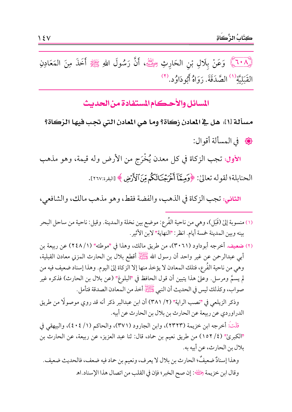 (¬٢) ضعيف. أخرجه أبوداود (٣٠٦١)، من طريق مالك، وهذا في «موطئه» (١/ ٢٤٨) عن ربيعة بن أبي عبدالرحمن عن غير واحد أن رسول الله -صلى الله عليه وعلى آله وسلم- أقطع بلال بن الحارث المزني معادن القبلية، وهي من ناحية الفُرع، فتلك المعادن لا يؤخذ منها إلا الزكاة إلى اليوم. وهذا إسناد ضعيف فيه من لم يسمَّ ومرسل. وعلى هذا يتبين أن قول الحافظ في «البلوغ» (عن بلال بن الحارث) فذكره غير صواب، وكذلك ليس في الحديث أن النبي -صلى الله عليه وعلى آله وسلم- أخذ من المعادن الصدقة فتأمل.