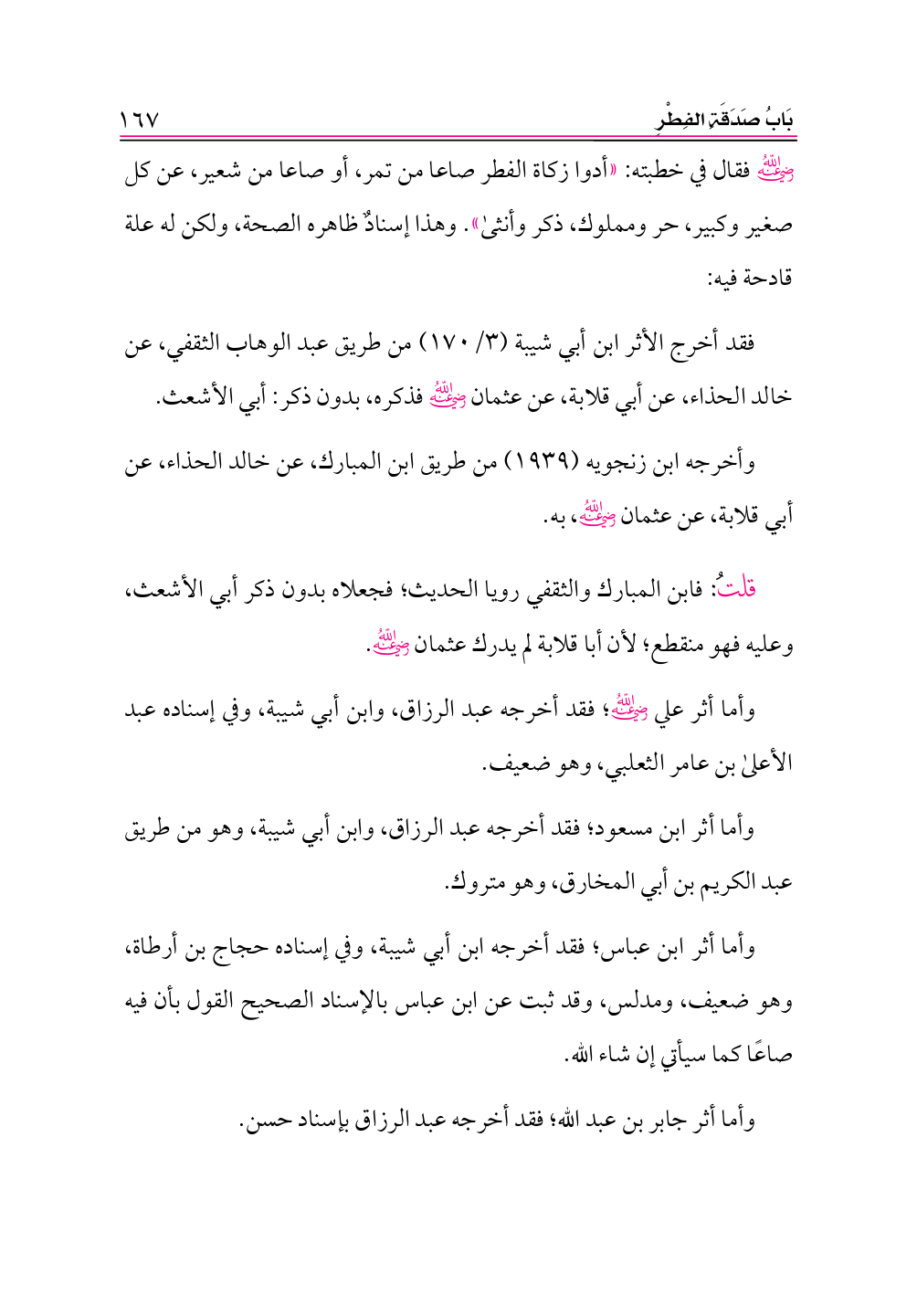 -رضي الله عنه- فقال في خطبته: «أدوا زكاة الفطر صاعا من تمر، أو صاعا من شعير، عن كل صغير وكبير، حر ومملوك، ذكر وأنثى». وهذا إسنادٌ ظاهره الصحة، ولكن له علة قادحة فيه: