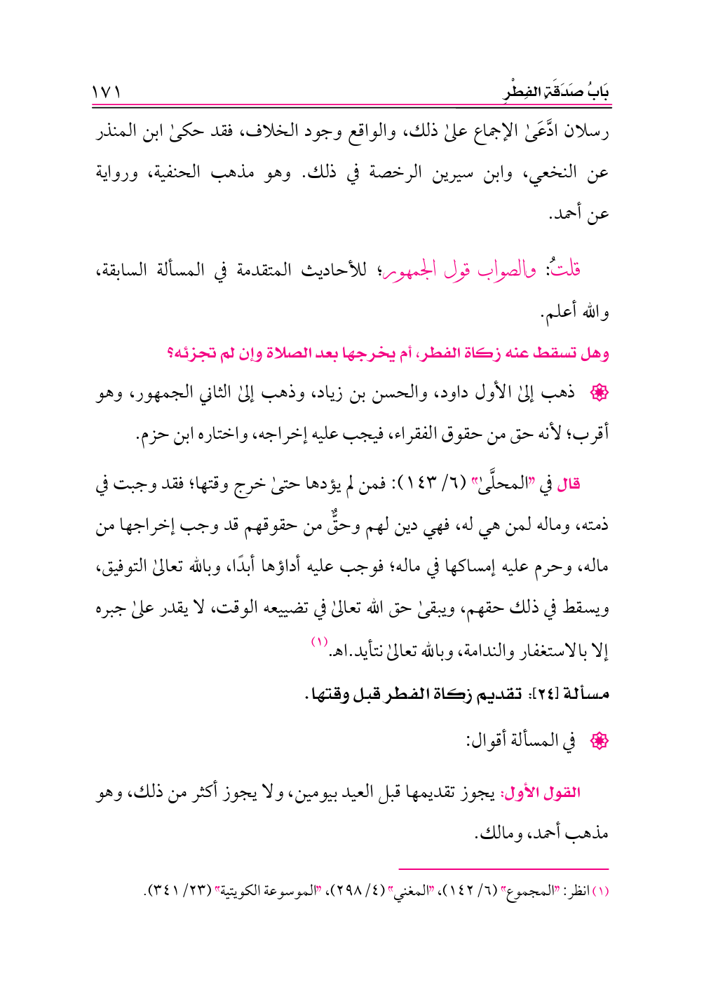 (¬١) انظر: «المجموع» (٦/ ١٤٢)، «المغني» (٤/ ٢٩٨)، «الموسوعة الكويتية» (٢٣/ ٣٤١).
