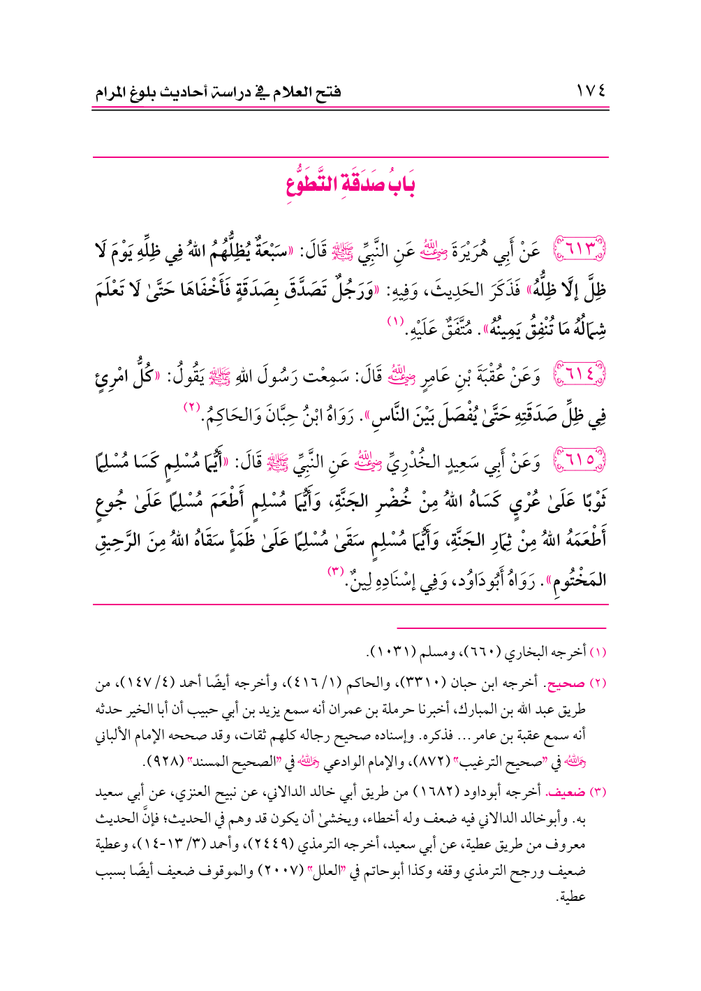 ٦١٣ - عَنْ أَبِي هُرَيْرَةَ -رضي الله عنه- عَنِ النَّبِيِّ - صلى الله عليه وسلم - قَالَ: «سَبْعَةٌ يُظِلُّهُمُ اللهُ فِي ظِلِّهِ يَوْمَ لَا ظِلَّ إلَّا ظِلُّهُ» فَذَكَرَ الحَدِيثَ، وَفِيهِ: «وَرَجُلٌ تَصَدَّقَ بِصَدَقَةٍ فَأَخْفَاهَا حَتَّى لَا تَعْلَمَ شِمَالُهُ مَا تُنْفِقُ يَمِينُهُ». مُتَّفَقٌ عَلَيْهِ. (¬١)