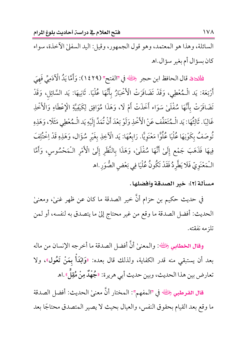 فائدة: قال الحافظ ابن حجر -رحمه الله- في «الفتح» (١٤٢٩): وَأَمَّا يَدُ الْآدَمِيِّ فَهِيَ أَرْبَعَة: يَد الْمُعْطِي، وَقَدْ تَضَافَرَتْ الْأَخْبَارُ بِأَنَّهَا عُلْيَا. ثَانِيهَا: يَد السَّائِلِ، وَقَدْ تَضَافَرَتْ بِأَنَّهَا سُفْلَى سَوَاء أَخَذَتْ أَمْ لَا، وَهَذَا مُوَافِق لِكَيْفِيَّةِ الْإِعْطَاءِ وَالْأَخْذِ غَالِبًا. ثَالِثُهَا: يَد الْمُتَعَفِّف عَنْ الْأَخْذِ وَلَوْ بَعْدَ أَنْ تُمَدَّ إِلَيْهِ يَد الْمُعْطِي مَثَلًا، وَهَذِهِ تُوصَفُ بِكَوْنِهَا عُلْيَا عُلُوًّا مَعْنَوِيًّا. رَابِعُهَا: يَد الْآخِذِ بِغَيْرِ سُؤَال، وَهَذِهِ قَدْ اِخْتُلِفَ فِيهَا فَذَهَبَ جَمْع إِلَى أَنَّهَا سُفْلَى، وَهَذَا بِالنَّظَرِ إِلَى الْأَمْرِ الْمَحْسُوسِ، وَأَمَّا الْمَعْنَوِيّ فَلَا يَطَّرِدُ فَقَدْ تَكُونُ عُلْيَا فِي بَعْضِ الصُّوَرِ. اهـ