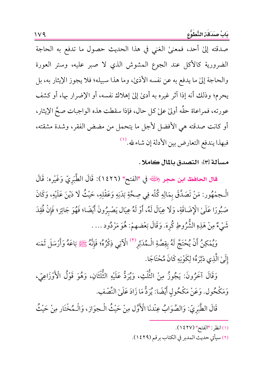 صدقته إلى أحد، فمعنى الغني في هذا الحديث حصول ما تدفع به الحاجة الضرورية كالأكل عند الجوع المشوش الذي لا صبر عليه، وستر العورة والحاجة إلى ما يدفع به عن نفسه الأذى، وما هذا سبيله؛ فلا يجوز الإيثار به، بل يحرم؛ وذلك أنه إذا آثر غيره به أدى إلى إهلاك نفسه، أو الإضرار بها، أو كشف عورته، فمراعاة حقِّه أولى على كل حال، فإذا سقطت هذه الواجبات صحَّ الإيثار، أو كانت صدقته هي الأفضل لأجل ما يتحمل من مضض الفقر، وشدة مشقته، فبهذا يندفع التعارض بين الأدلة إن شاء لله. (¬١)