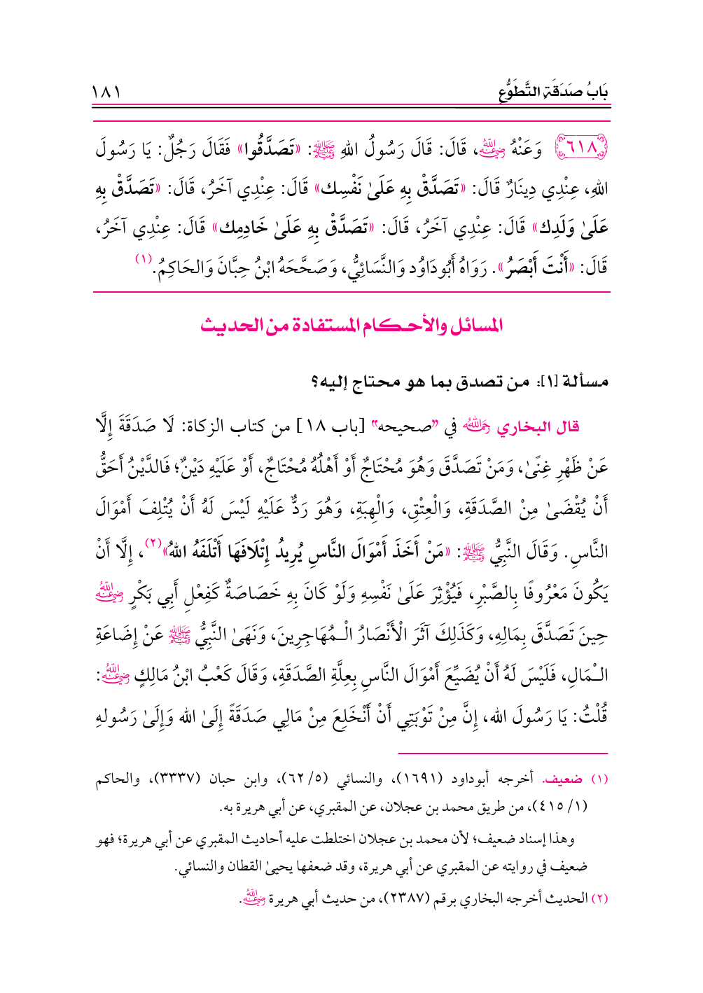 قال البخاري -رحمه الله- في «صحيحه» [باب ١٨] من كتاب الزكاة: لَا صَدَقَةَ إِلَّا عَنْ ظَهْرِ غِنًى، وَمَنْ تَصَدَّقَ وَهُوَ مُحْتَاجٌ أَوْ أَهْلُهُ مُحْتَاجٌ، أَوْ عَلَيْهِ دَيْنٌ؛ فَالدَّيْنُ أَحَقُّ أَنْ يُقْضَى مِنْ الصَّدَقَةِ، وَالْعِتْقِ، وَالْهِبَةِ، وَهُوَ رَدٌّ عَلَيْهِ لَيْسَ لَهُ أَنْ يُتْلِفَ أَمْوَالَ النَّاسِ. وَقَالَ النَّبِيُّ - صلى الله عليه وسلم -: «مَنْ أَخَذَ أَمْوَالَ النَّاسِ يُرِيدُ إِتْلَافَهَا أَتْلَفَهُ اللهُ» (¬٢)، إِلَّا أَنْ يَكُونَ مَعْرُوفًا بِالصَّبْرِ، فَيُؤْثِرَ عَلَى نَفْسِهِ وَلَوْ كَانَ بِهِ خَصَاصَةٌ كَفِعْلِ أَبِي بَكْرٍ -رضي الله عنه- حِينَ تَصَدَّقَ بِمَالِهِ، وَكَذَلِكَ آثَرَ الْأَنْصَارُ الْمُهَاجِرِينَ، وَنَهَى النَّبِيُّ - صلى الله عليه وسلم - عَنْ إِضَاعَةِ الْمَالِ، فَلَيْسَ لَهُ أَنْ يُضَيِّعَ أَمْوَالَ النَّاسِ بِعِلَّةِ الصَّدَقَةِ، وَقَالَ كَعْبُ ابْنُ مَالِكٍ -رضي الله عنه-: قُلْتُ: يَا رَسُولَ الله، إِنَّ مِنْ تَوْبَتِي أَنْ أَنْخَلِعَ مِنْ مَالِي صَدَقَةً إِلَى الله وَإِلَى رَسُولهِ