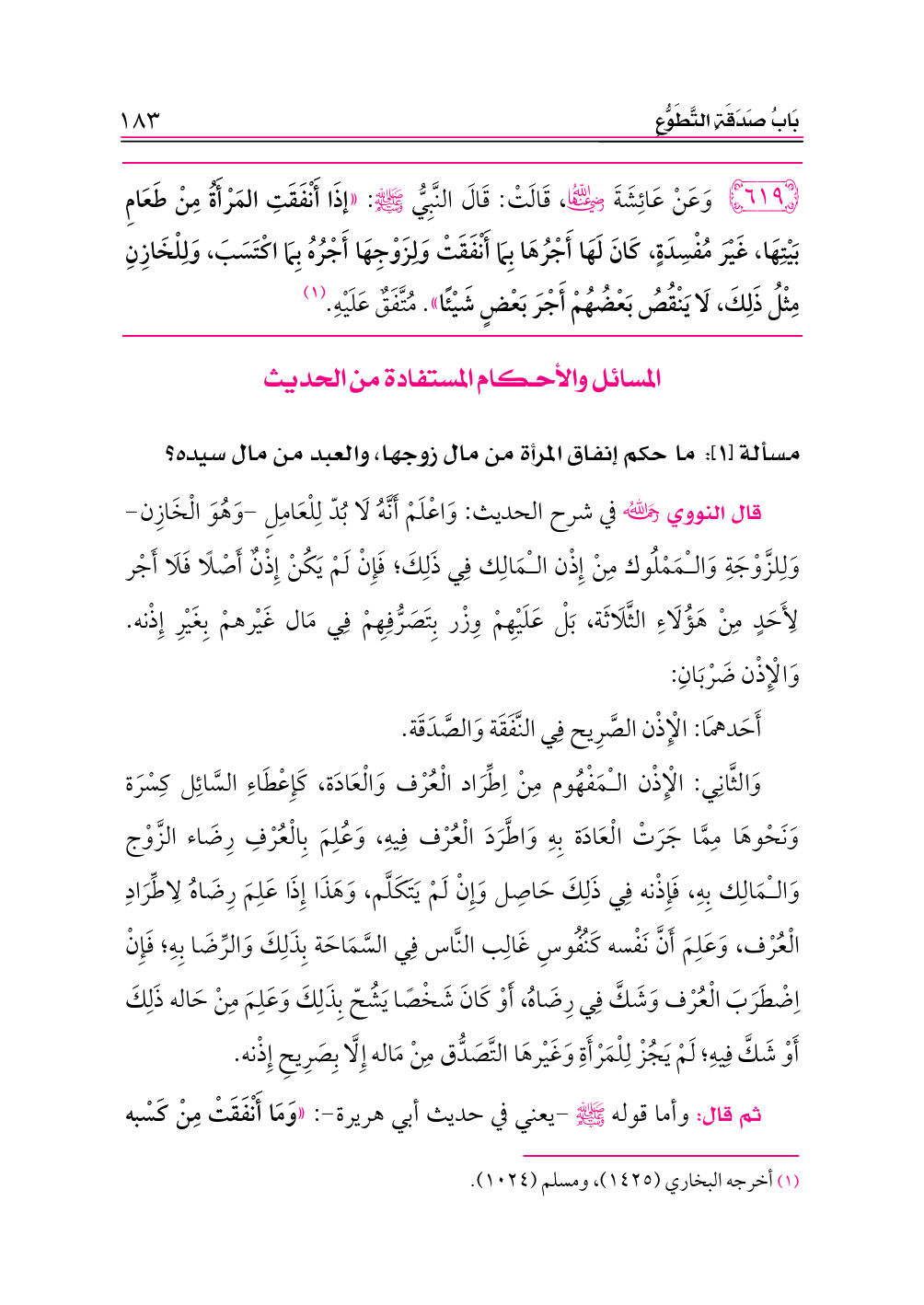٦١٩ - وَعَنْ عَائِشَةَ -رضي الله عنها-، قَالَتْ: قَالَ النَّبِيُّ - صلى الله عليه وسلم -: «إذَا أَنْفَقَتِ المَرْأَةُ مِنْ طَعَامِ بَيْتِهَا، غَيْرَ مُفْسِدَةٍ، كَانَ لَهَا أَجْرُهَا بِمَا أَنْفَقَتْ وَلِزَوْجِهَا أَجْرُهُ بِمَا اكْتَسَبَ، وَلِلْخَازِنِ مِثْلُ ذَلِكَ، لَا يَنْقُصُ بَعْضُهُمْ أَجْرَ بَعْضٍ شَيْئًا». مُتَّفَقٌ عَلَيْهِ. (¬١)