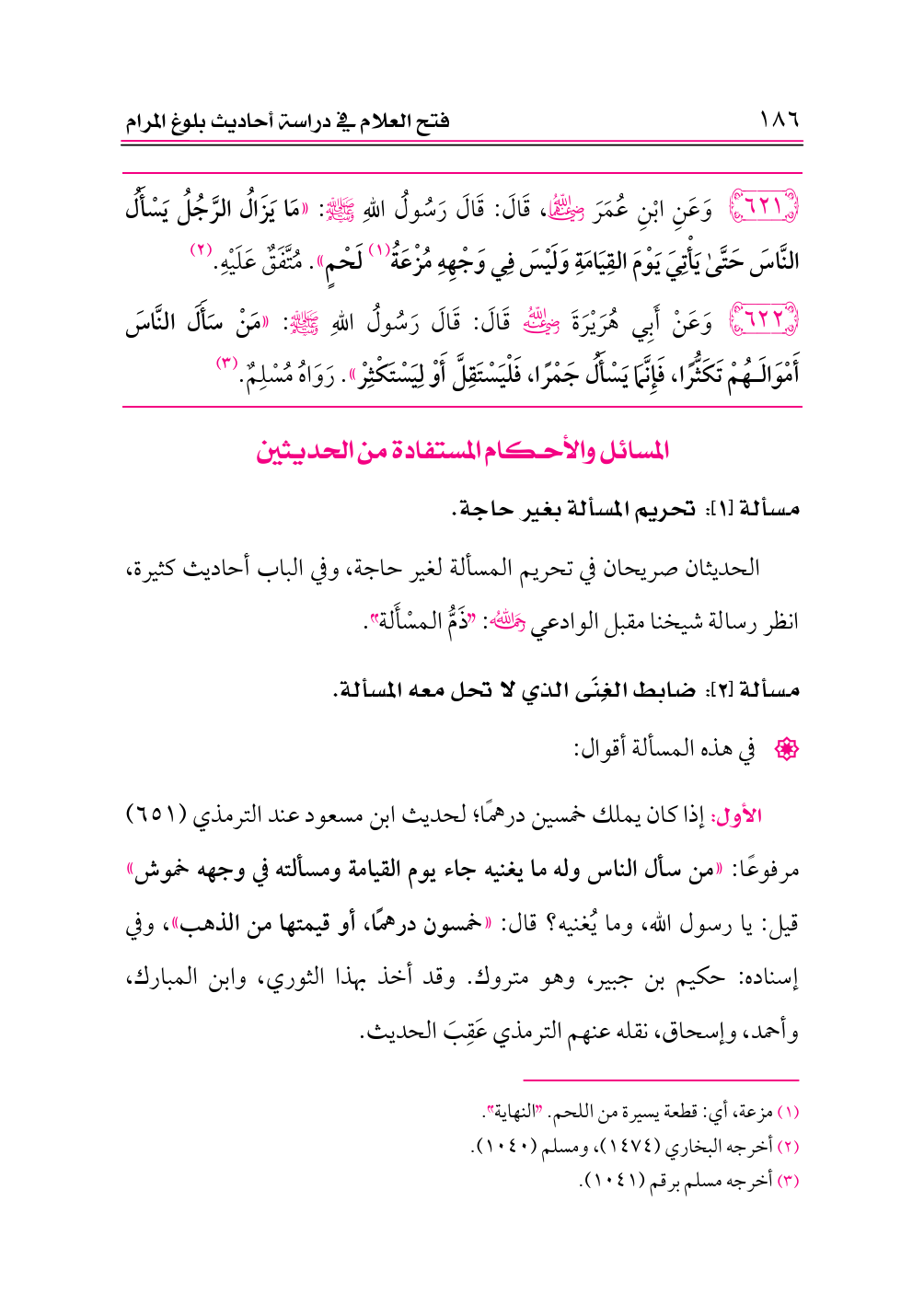 ٦٢١ - وَعَنِ ابْنِ عُمَرَ -رضي الله عنهما-، قَالَ: قَالَ رَسُولُ اللهِ - صلى الله عليه وسلم -: «مَا يَزَالُ الرَّجُلُ يَسْأَلُ النَّاسَ حَتَّى يَأْتِيَ يَوْمَ القِيَامَةِ وَلَيْسَ فِي وَجْهِهِ مُزْعَةُ (¬١) لَحْمٍ». مُتَّفَقٌ عَلَيْهِ. (¬٢)