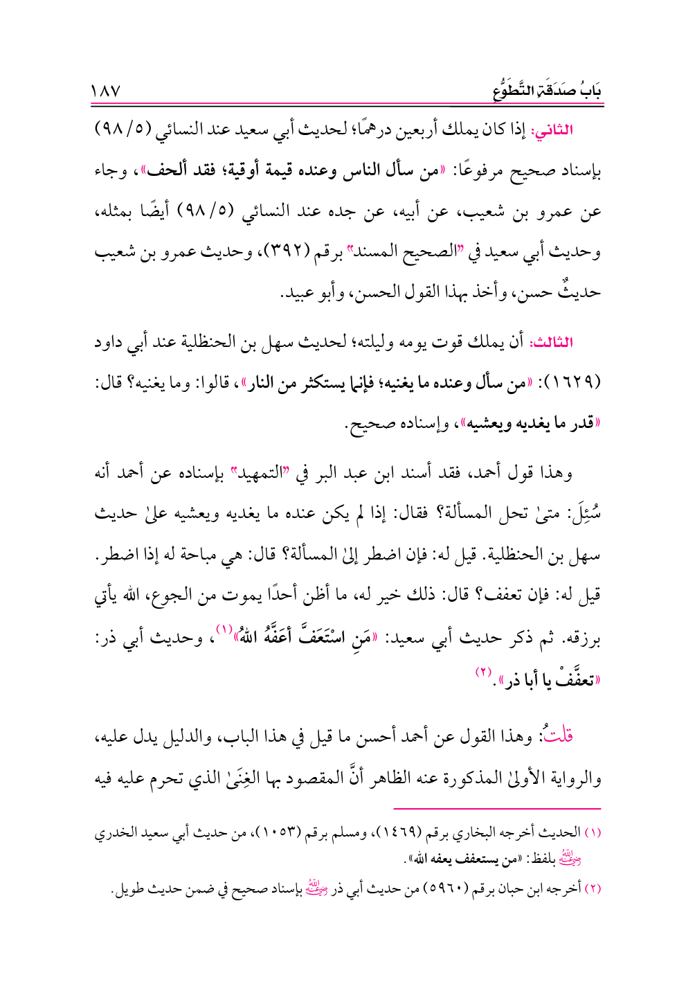 الثاني: إذا كان يملك أربعين درهمًا؛ لحديث أبي سعيد عند النسائي (٥/ ٩٨) بإسناد صحيح مرفوعًا: «من سأل الناس وعنده قيمة أوقية؛ فقد ألحف»، وجاء عن عمرو بن شعيب، عن أبيه، عن جده عند النسائي (٥/ ٩٨) أيضًا بمثله، وحديث أبي سعيد في «الصحيح المسند» برقم (٣٩٢)، وحديث عمرو بن شعيب حديثٌ حسن، وأخذ بهذا القول الحسن، وأبو عبيد.