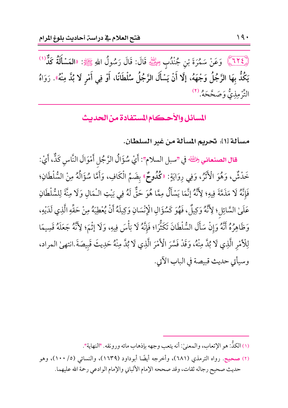 ٦٢٤ - وَعَنْ سَمُرَةَ بْنِ جُنْدُبٍ -رضي الله عنه- قَالَ: قَالَ رَسُولُ اللهِ - صلى الله عليه وسلم -: «المَسْأَلَةُ كَدٌّ (¬١) يَكُدُّ بِهَا الرَّجُلُ وَجْهَهُ، إلَّا أَنْ يَسْأَلَ الرَّجُلُ سُلْطَانًا، أَوْ فِي أَمْرٍ لَا بُدَّ مِنْهُ». رَوَاهُ التِّرْمِذِيُّ وَصَحَّحَهُ. (¬٢)